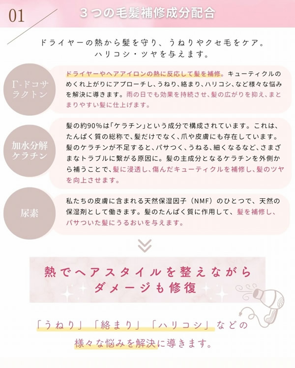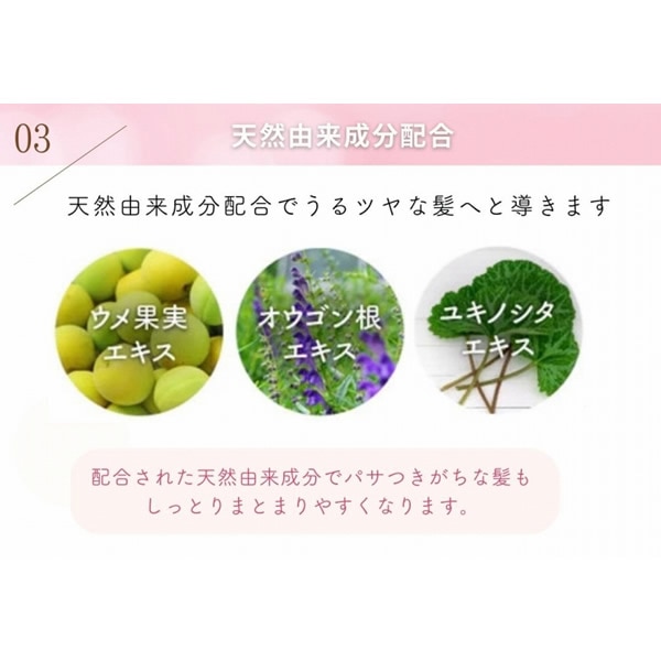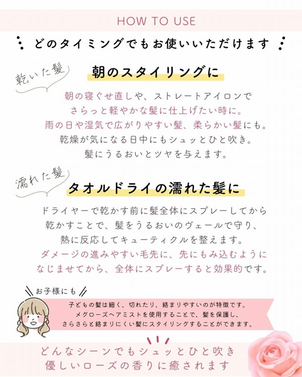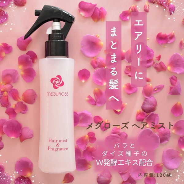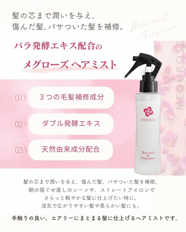 【商品詳細】 商品名: メグローズ ヘアミスト 商品説明: 髪の芯まで潤いを与え、傷んだ髪、パサついた髪を補修。 手触りの良い、エアリーにまとまる髪に仕上げるヘアミストです。 ダブル処方の発酵エキスが乾燥しがちな髪に香りとうるおいを与え、柔らかで手触りのよい髪を叶えます。 朝の寝ぐせ直しのシーンや、ストレートアイロンでさらっと軽やかな髪に仕上げたい時に。 湿気で広がりやすい髪や柔らかい髪にも使いやすい。 朝のスタイリングにも、タオルドライの濡れた髪にも。どんなシーンでもシュッとひと吹き。優しいローズの香りに癒されます。 華やかなローズの香りに包まれる、幸福なヘアケア時間。 ふんわりと香りのベールを纏って、髪から美しさを引き立てます。 全成分: 水、ポリソルベート20、ジメチコン、プロパンジオール、アスペルギルス/ダイズ種子エキス発酵エキス液、乳酸桿菌/センチフォリアバラ花エキス発酵液、γ-ドコサラクトン、加水分解ケラチン(羊毛)、カルボキシメチルキトサンサクシナミド、ユキノシタエキス、ウメ果実エキス、オウゴン根エキス、クラドシホンノバエカレドニアエ多糖体、ジステアリルジモニウムクロリド、尿素、ベヘントリモニウムクロリド、フィトステロールズ、BG、エタノール、ペンチレングリコール、ラウレス-2、ラウレス-21、フェノキシエタノール、香料 使用方法: ご使用前に容器をよく振り1~2プッシュを髪へまんべんなくスプレーしてから、手で揉むようにやさしくなじませてください。 使用上の注意: ●製品の特性上、髪を保護する成分が粒上に浮いてくる場合がございますが品質に問題はございません。よく振ってお使いください。 ●お肌、頭皮に異常が生じていないかよく注意して使用してください。 ●化粧品がお肌に合わないとき、即ち次のような場合には、使用を中止してください。そのまま化粧品類の使用を続けますと症状を悪化させることがありますので皮膚科専門医等にご相談されることをおすすめします。 ・使用中、赤み、はれ、かゆみ、刺激、色抜け(白斑等)や黒ずみ等の異常があらわれた場合 ・使用したお肌に、直射日光が当たって上記のような異常があらわれた場合 ●傷やはれもの、しっしん等、異常のある部位にはお使いにならないでください。 ●極端に高温又は低温の場所、直射日光があたる場所には保管しないでください。 ●乳幼児の手の届かない所に保管してください。 生産国: 日本 区分: 整髪料 メーカー: 株式会社アイリス 注意事項: 当社では複数店舗で在庫を共有しており、システムで在庫調整を行っておりますが、TV放映等による一時的な注文数の増大や、在庫の更新タイミングにより在庫にずれが生じる場合がございます。 在庫更新が間に合わずご注文頂いた商品が欠品となる場合もございます。 欠品が生じた場合や商品の発送が遅れる場合は、改めてご連絡させていただきます。 ご迷惑をお掛けする場合がございますが、あらかじめご了承くださいませ。 広告文責: 株式会社エーウィル 0747-26-5566