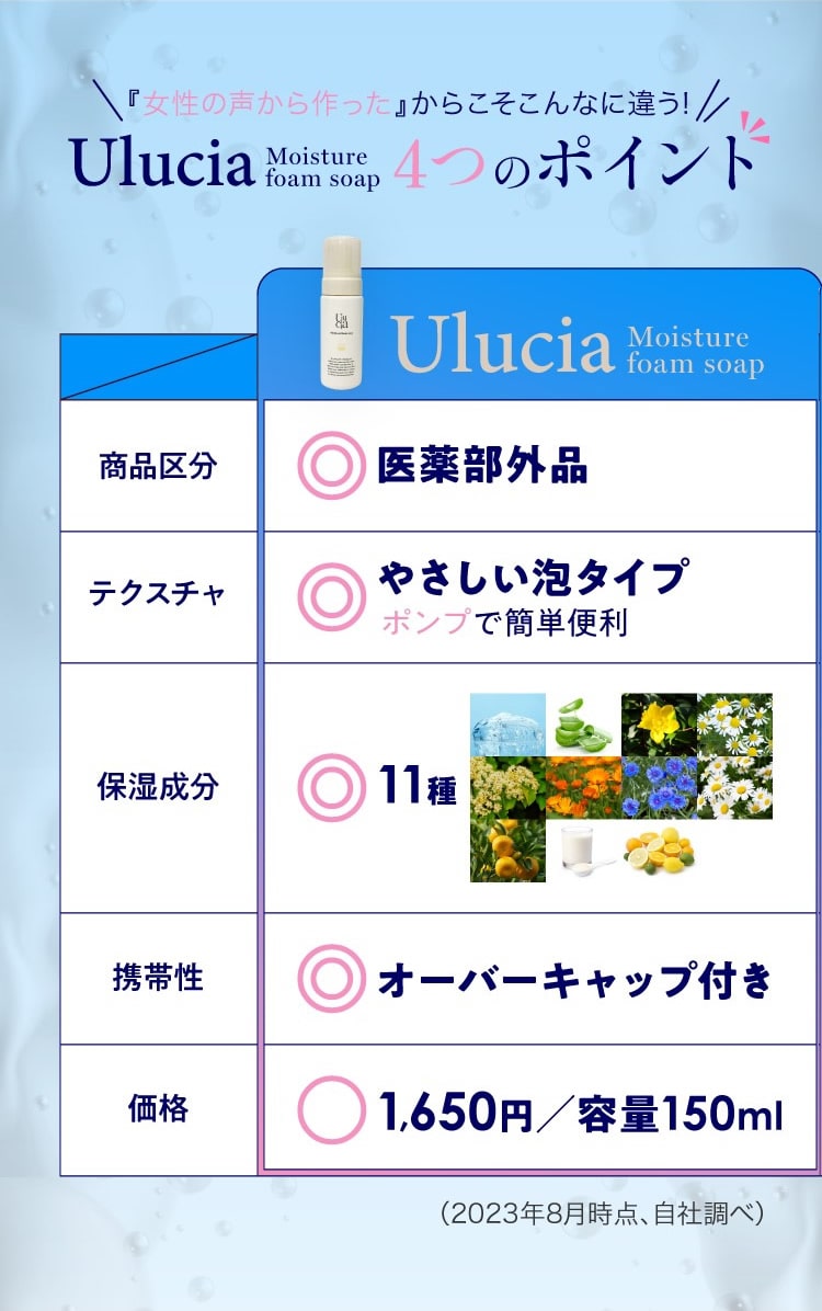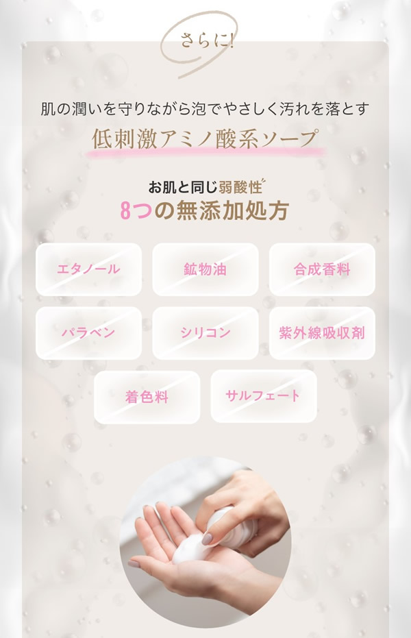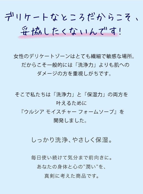 【商品詳細】 商品名: ウルシア モイスチャーフォームソープ 商品説明: ”洗浄力”も”保湿力”もバッチリ♪ 贅沢リッチなデリケートゾーン薬用ソープ こだわり抜いた美容保湿成分を贅沢に11種類も配合し、汚れをさっぱり洗い流し、必要なうるおいはキープ。 低刺激のアミノ酸系ソープだからやさしく洗い上げます。もちろん全身にもお使いいただけます。 8つの無添加処方で成分や品質にこだわりました。 さらに泡タイプだからクリーミーな泡で摩擦による皮膚の刺激も減らし、こすらずに汚れを落とします。 『しっかり洗浄、やさしく保湿。』 毎日使い続けて気分まで前向きに。 女性の身体と心の”潤い”を、真剣に考えた商品です。 内容量: 150ml 全成分: 【有効成分】ミコナゾール硝酸塩、イソプロピルメチルフェノール 【その他成分】ラウリン酸アミドプロピルベタイン液、ジプロピレングリコール、安息香酸ナトリウム、ポリメタクリロイルエチルジメチルベタイン液、フェノキシエタノール、濃グリセリン、2-メタクリロイルオキシエチルホスホリルコリン・メタクリル酸ブチル共重合体液、ラウロイルメチル-β-アラニンナトリウム液、エデト酸ニナトリウム、ヒアルロン酸ヒドロキシプロピルトリモニウム、パラオキシ安息香酸メチル、アロエエキス(2)、1,3-ブチレングリコール、オトギリソウエキス、カモミラエキス(1)、シナノキエキス、トウキンセンカエキス、ヤグルマギクエキス、ローマカミツレエキス、チンピエキス、ホエイ(2)、テトラ2-ヘキシルデカン酸アスコルビル 使用方法: 適量を手にとりやさしく洗いその後洗い流してください。 使用上の注意: ●お肌に異常が生じていないかよく注意してご使用ください。 ●お肌にあわない時即ち次のような場合には使用を中止してください。そのまま使用を続けますと症状を悪化させることがありますので皮膚科の専門医等にご相談されることをおすすめします。 (1)使用中、赤味、はれ、かゆみ、刺激等の異常が現れた場合 (2)使用したお肌に直射日光があたって上記のような症状があらわれた場合 ●傷やはれもの、しっしん、皮ふ炎(かぶれ、ただれ)等の皮膚障害があるときには悪化させるおそれがありますので使用しないでください。 ●目に入った時には直ちに水またはぬるま湯で洗い流してください。 ●乳幼児の手の届かないところに保管してください。 ●極端に高温又は低温の場所、直射日光のあたる場所には保管しないで下さい。 製造国: 日本 区分: 医薬部外品 メーカー: 株式会社ティルトローター 注意事項: 当社では複数店舗で在庫を共有しており、システムで在庫調整を行っておりますが、TV放映等による一時的な注文数の増大や、在庫の更新タイミングにより在庫にずれが生じる場合がございます。 在庫更新が間に合わずご注文頂いた商品が欠品となる場合もございます。 欠品が生じた場合や商品の発送が遅れる場合は、改めてご連絡させていただきます。 ご迷惑をお掛けする場合がございますが、あらかじめご了承くださいませ。 広告文責: 株式会社エーウィル 0747-26-5566