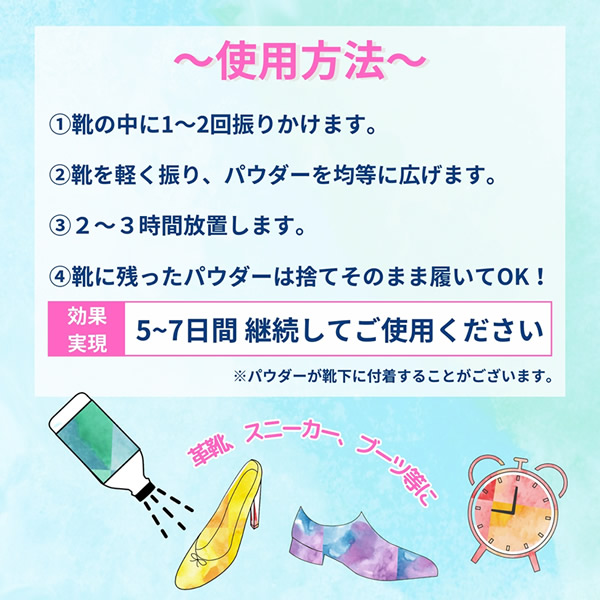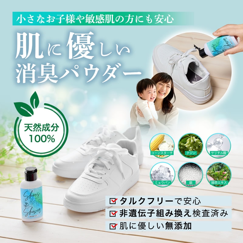 【商品詳細】 商品名: シューズシャワー 靴専用消臭パウダー 容量: 70g 成分: ミョウバン、銀、緑茶、コーンスターチ、他 区分: 雑貨 原産国: 中国 販売元: 株式会社トランスペクト 注意事項: 当社では複数店舗で在庫を共有しており、システムで在庫調整を行っておりますが、TV放映等による一時的な注文数の増大や、在庫の更新タイミングにより在庫にずれが生じる場合がございます。 在庫更新が間に合わずご注文頂いた商品が欠品となる場合もございます。 欠品が生じた場合や商品の発送が遅れる場合は、改めてご連絡させていただきます。 ご迷惑をお掛けする場合がございますが、あらかじめご了承くださいませ。 広告文責: 株式会社エーウィル 0747-26-5566