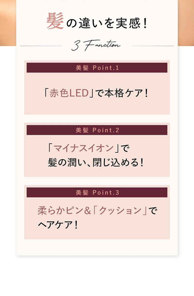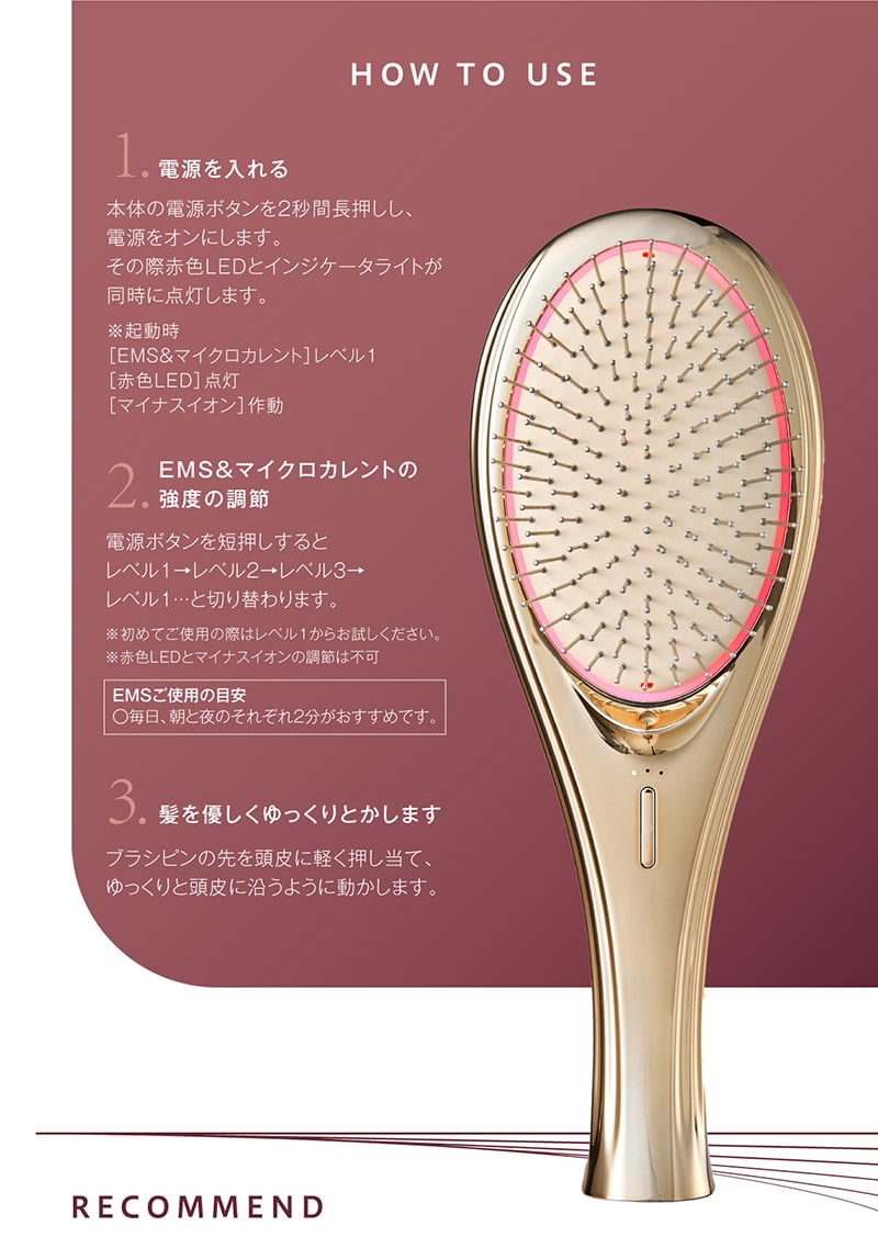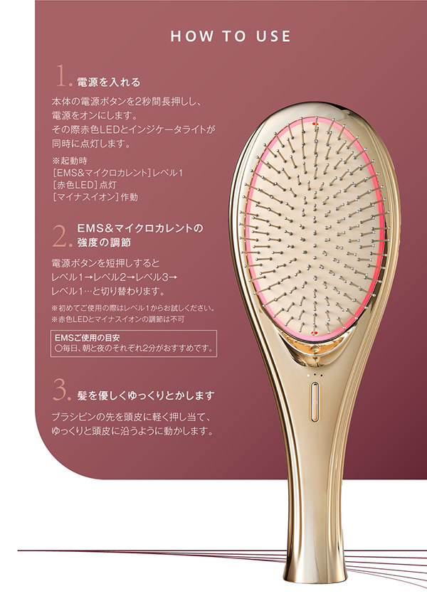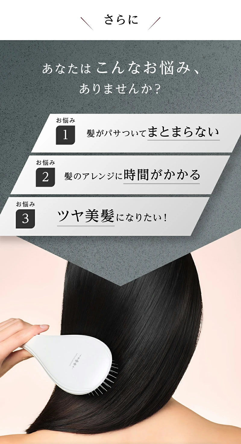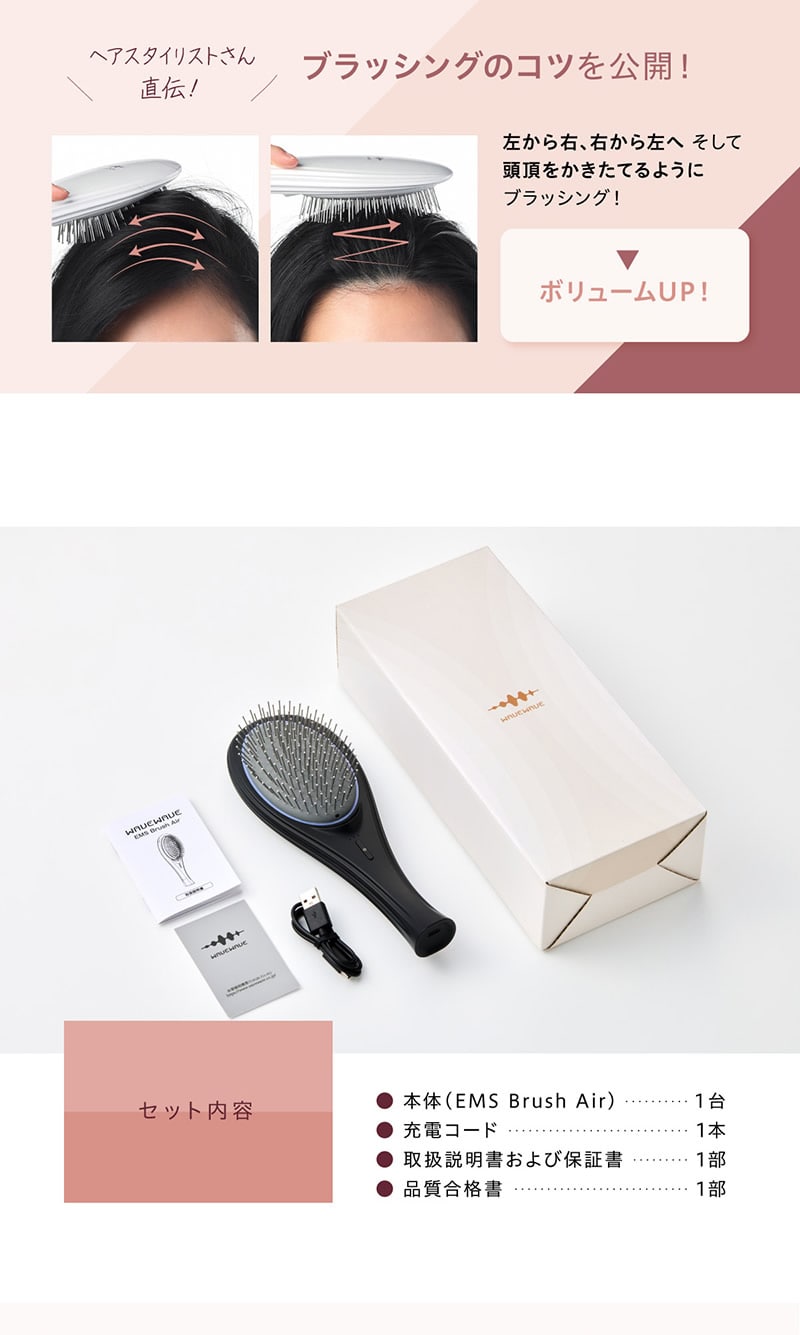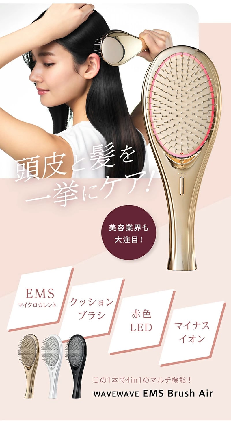 【商品詳細】 商品名: WAVEWAVE EMS ブラシエアー 商品説明: WAVEWAVE EMS Brush Airが遂に完成。 毎日のスタイリングやブローに欠かせない人気のクッションブラシと昨今美容業界でも注目されるEMSの初のコラボレーション。 従来のブラシや電気ブラシと異なり、クッションの柔軟性があるため、頭皮を傷めず、やさしくEMSを伝えます。 ブラシから放出されるのマイナスイオンがキューティクルに潤いを与え、そのままキープ。 カラー: ブラック ホワイト ゴールド 仕様: 型番 WH41-01 商品素材 ABS、ステンレス、TPE バッテリー容量 300mAh 定格電源 DC5V 1A 充電時間 約2.5時間 本体サイズ 227×82×48mm 重量 約138g 以下に当てはまる方は本製品を使わないでください。: ●心臓ペースメーカーなどの体内植込式医用電気機器を使用している方 ●人工心肺など生命維持用医用電気機器を使用している方 ●心電図などの装着型医用電気機器を使用している方 ●医師の治療を受けている方 ●18歳以下の方 ●発熱している方 ●妊娠中、生理中、授乳中の方 ●高血圧や低血圧の方 ●急性化膿性炎症のある方 ●心臓疾患、急性疾患、結核性疾患、悪性腫瘍、 血液疾患、内臓疾患、伝染病疾患のある方 ●血行障害、毛細血管拡張、血圧に異常のある方 ●皮膚の知覚障害や疾患がある方 ●身体的あるいは精神的に疾患があり、思いを自由に表現できない方 ●ステロイド系ホルモン剤の長期使用や肝機能障害で毛細血管拡張を起こしている方 ●皮膚病、アレルギー体質、アトピー性皮膚炎、皮膚トラブルがある方 ●目や体の手術を行った方 ●目や体に疾患がある方 ●強度近視(-6D以上)の方 ●過度の日焼けで肌や頭皮が炎症を起こしている方 ●眠気を誘う薬を服用中の方 次に該当する場合、または部位に使用しないでください。 事故や身体のトラブルが生じる恐れがあります。 ●切り傷や整形手術をした部位 ●化膿した皮膚 ●炎症箇所 ●痒みがある部位 ●膨らんだホクロ ●ウィルス性のイボ ●にきび ※ご自身で判断できない場合は、使用前に医師にご相談ください。 その他: ※本商品は、治療目的としたマッサージ器/医療機器ではありません。 製造国: 中国 区分: 家電 メーカー: 有限会社セブンウェイブ 注意事項: 当社では複数店舗で在庫を共有しており、システムで在庫調整を行っておりますが、TV放映等による一時的な注文数の増大や、在庫の更新タイミングにより在庫にずれが生じる場合がございます。 在庫更新が間に合わずご注文頂いた商品が欠品となる場合もございます。 欠品が生じた場合や商品の発送が遅れる場合は、改めてご連絡させていただきます。 ご迷惑をお掛けする場合がございますが、あらかじめご了承くださいませ。 広告文責: 株式会社エーウィル 0747-26-5566 様々な贈り物にご利用いただけます
