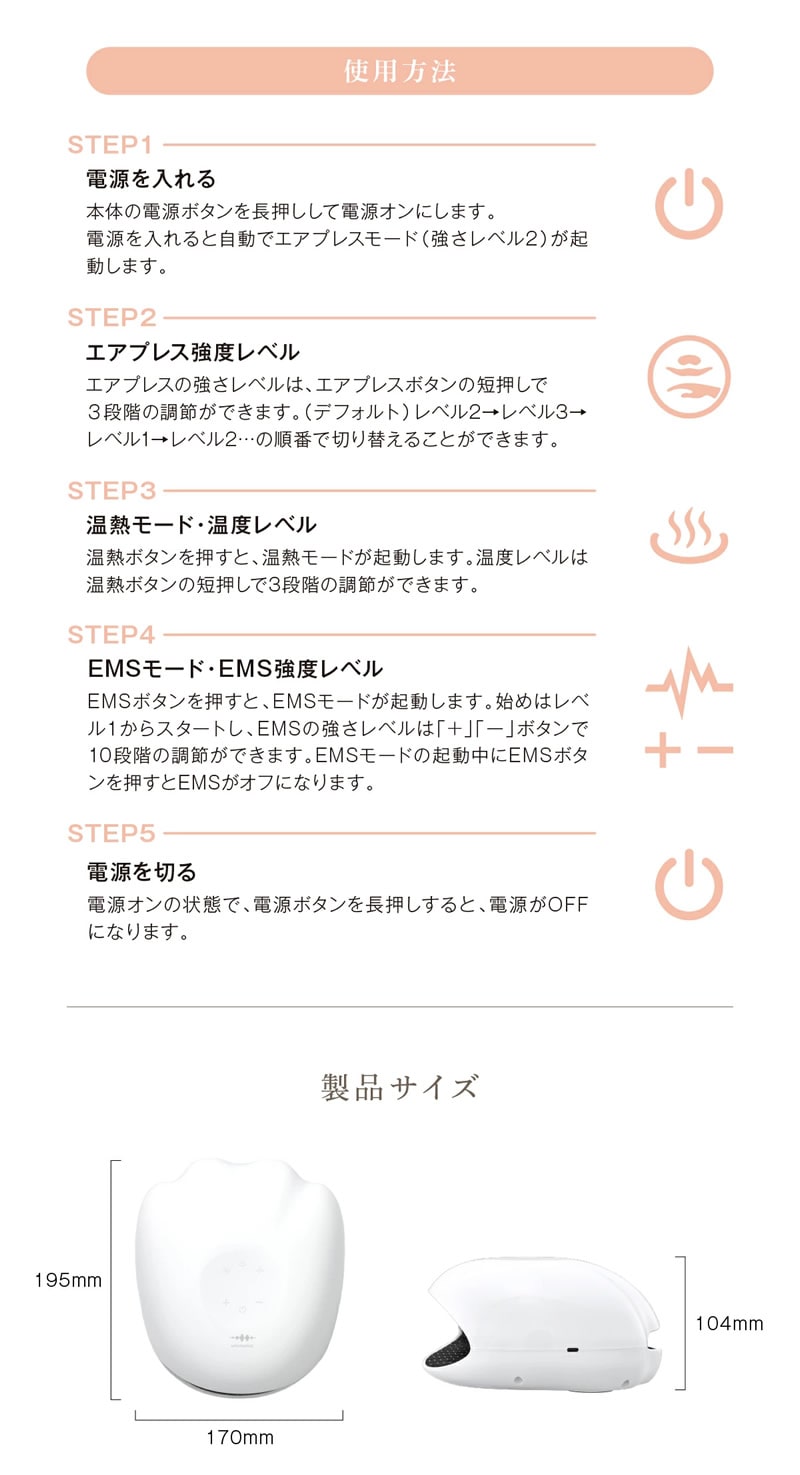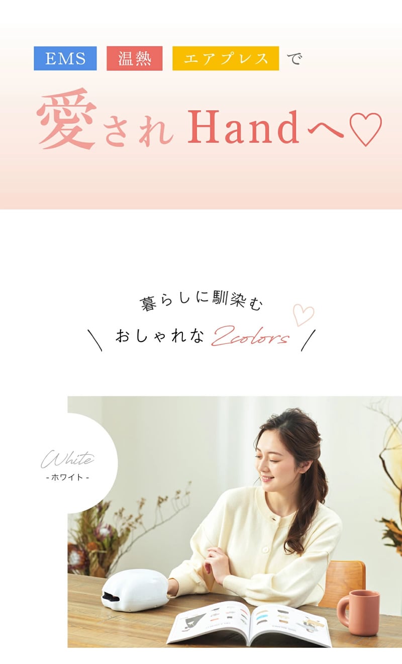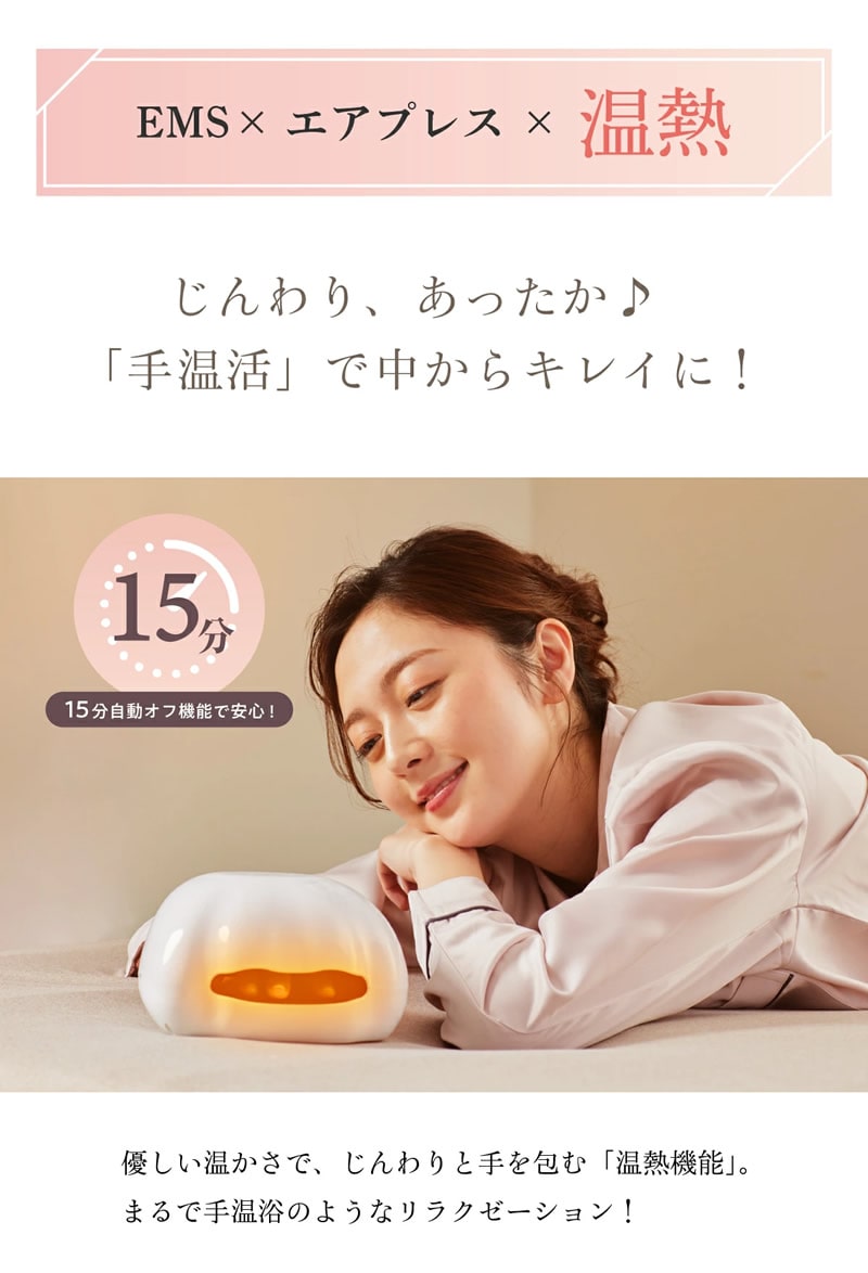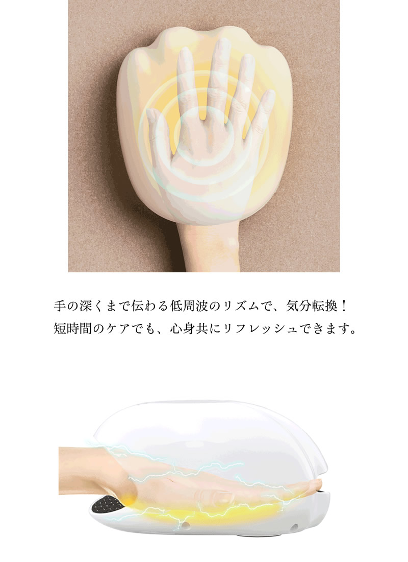 【商品詳細】 商品名:WAVEWAVE EMS ハンドエステ 商品説明: 可愛らしいアニマル柄に気持ち癒される「EMS Hand Esthe」。 EMS×温熱×エアープレスで手全体を包み込んでほぐしてくれるだけでなく、年齢の出やすいハンドへのお手軽な美容ケアとしても。 手の深くまで伝わる低周波のリズムに、短時間のケアでも心身ともにリフレッシュできる『EMS機能』(10段階の強度レベルあり)。 手の甲の中心部分を起点に低周波の刺激が先端まで走り、指ケアにも。 『温熱機能』はやさしい温かさでじんわりと手を包む、手温浴のようなリラクゼーション。 3段階の温熱レベルからお好みで選べ、ハンドクリームを塗り密閉した状態で温めると潤いがキープされ、しっとりとした手元になります。 まるで人の手でもみほぐすような感覚の『エアプレス機能』は、上下からエアバッグに包まれ、やみつきの心地よさ。 エアバッグを膨らませたりしぼませたりすることで加圧し、手のひらや裏、全体を順番にしっかりと押していきます。 また持ち運びに便利なコードレス、安心して使える自動タイマー機能、お掃除しやすいナイロン仕様、肉球デザインストッパーなど使うほどに愛着が沸くディテールも! どなたでもフィットするサイズ感に、男性女性関係なく、安心してお使いいただけます。 仕様: 型番 WH41-02 商品素材 ABS バッテリー容量 2500mAh 定格電源 DC5V 1A 充電時間 約3時間 本体サイズ 195×170×104mm 重量 約692g ご注意: ※本商品は、治療目的とした マッサージ器/医療機器ではありません。 以下に当てはまる方は本製品を使わないでください。 ●悪性腫瘍のある方 ●心臓ペースメーカーなどの体内植込型医用電気機器を使用している方 ●人工心肺などの生命維持用医用電気機器を使用している方 ●心電計などの装着型医用電気機器を使用している方 ●出血傾向のある方 ●妊婦、授乳中の方 ●心臓疾患のある方、血栓のある方 ●医師から、EMS機器・ハンドマッサージ 機器の使用を禁じられている方 ●心臓と脳の神経に疾患のある方 ●血行障害、毛細血管拡張などの疾患がある方 ●糖尿病などの末梢循環障害による感覚障害がある方 ●急性化膿性炎症のある方 ●皮膚の知覚障害がある方、または皮膚に疾患がある方 ●体温が38度を超えている方 ●四肢の不自由な方 ●感染症を患っている方 ●高血圧または低血圧がひどい方 ●身体的あるいは精神的に疾患があり、思いを自由に表現できない方 ●皮膚に金属アレルギーのある方 ●骨折や整形などで手に埋め込み手術を受けた方 ●乳児、子どもや高齢の方など熱さを自覚できない方 ●18歳以下の方 下記の方は医師にご相談の上ご使用ください。 ●医療機関で治療中の方 ●薬を服用中の方 製造国:中国 区分:家電 メーカー:有限会社セブンウェイブ 注意事項: 当社では複数店舗で在庫を共有しており、システムで在庫調整を行っておりますが、TV放映等による一時的な注文数の増大や、在庫の更新タイミングにより在庫にずれが生じる場合がございます。 在庫更新が間に合わずご注文頂いた商品が欠品となる場合もございます。 欠品が生じた場合や商品の発送が遅れる場合は、改めてご連絡させていただきます。 ご迷惑をお掛けする場合がございますが、あらかじめご了承くださいませ。 広告文責:株式会社エーウィル 0747-26-5566 【様々な贈り物にご利用いただけます】 内祝い・お返し: 出産内祝い 結婚内祝い 新築内祝い 快気祝い 入学内祝い 結納返し 香典返し 引き出物 結婚式 引出物 法事 引出物 お礼 謝礼 御礼 お祝い返し 成人祝い 卒業祝い 結婚祝い 出産祝い 誕生祝い 初節句祝い 入学祝い 就職祝い 新築祝い 開店祝い 移転祝い 退職祝い 還暦祝い 古希祝い 喜寿祝い 米寿祝い 退院祝い 昇進祝い 栄転祝い 叙勲祝い 大切な人への贈り物に: お父さん お母さん 兄弟 姉妹 子供 おばあちゃん おじいちゃん 奥さん 彼女 旦那さん 彼氏 恩師 先生 親友 友達 職場 先輩 後輩 同僚 その他・法人向け: プレゼント お土産 手土産 プチギフト お見舞 ご挨拶 引越しの挨拶 誕生日 バースデー お取り寄せ 開店祝い 開業祝い 周年記念 記念品 お茶請け 菓子折り おもたせ 贈答品 挨拶回り 定年退職 転勤 お客様 来客 ご成約記念 表彰 季節のご挨拶: 御正月 お正月 御年賀 お年賀 御年始 節分 旧正月 バレンタインデー 七五三 ひな祭り ホワイトデー 卒業 卒園 入学 入社 就職 新生活 新年度 ゴールデンウイーク こどもの日 母の日 父の日 初盆 お盆 御中元 お中元 お彼岸 残暑御見舞 残暑見舞い 敬老の日 運動会 体育祭 学園祭 寒中お見舞 クリスマス バレンタイン お歳暮 御歳暮