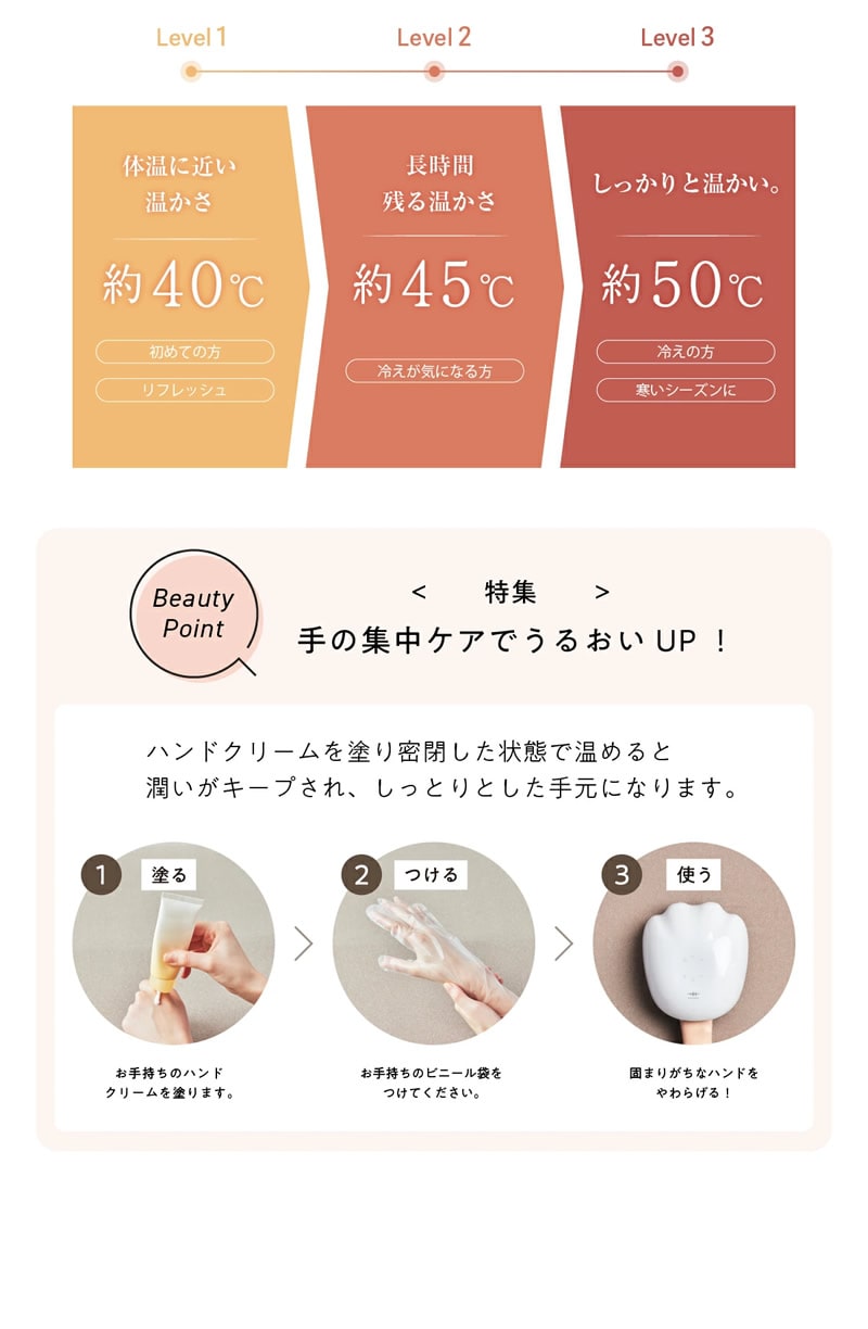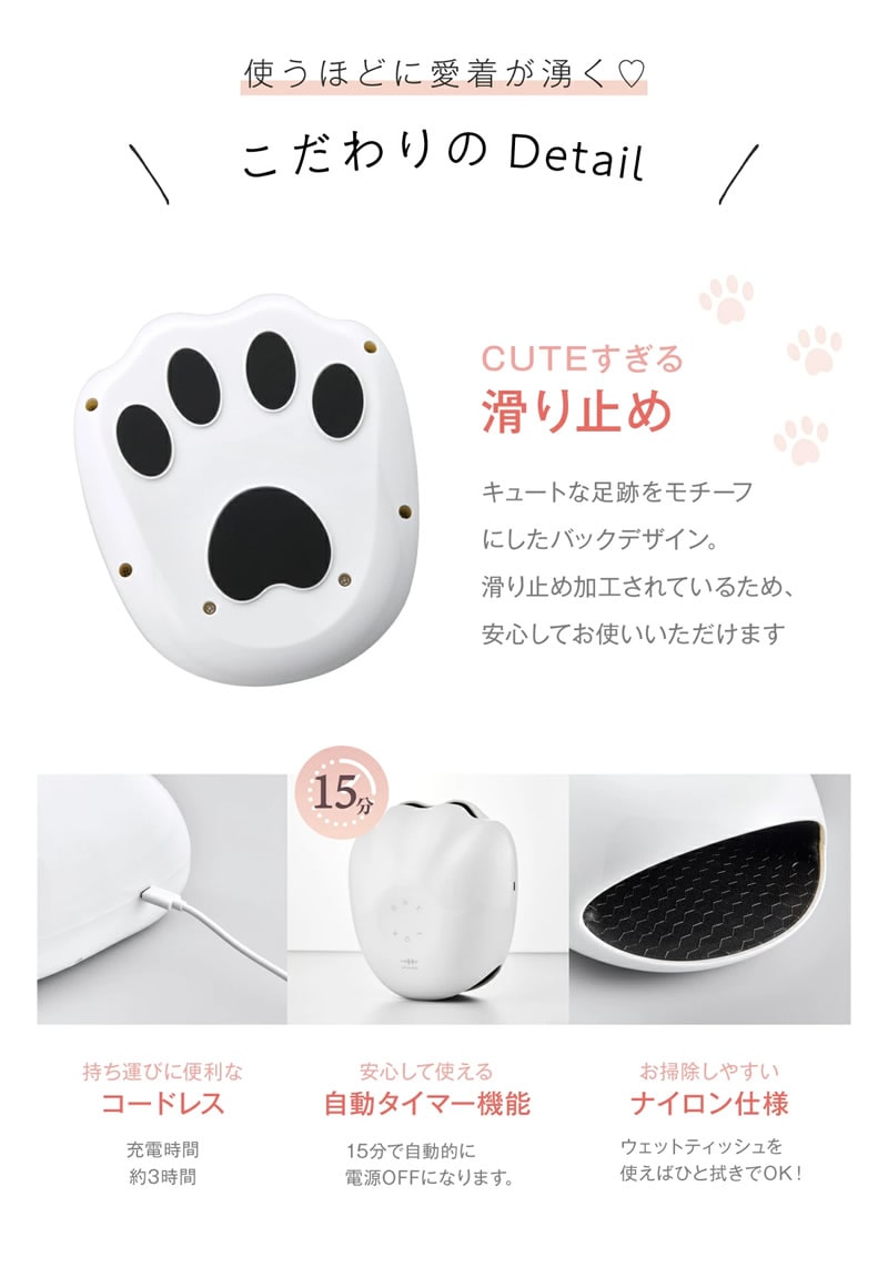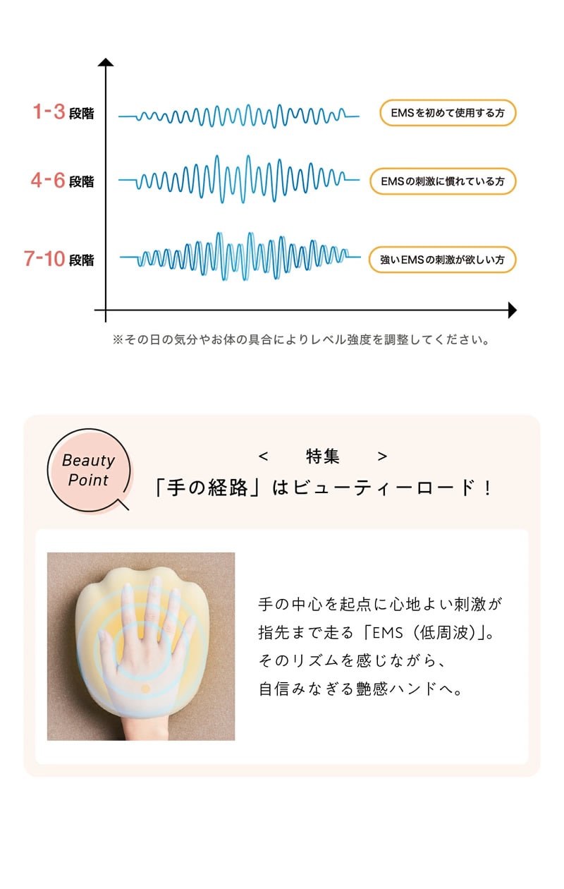 【商品詳細】 商品名:WAVEWAVE EMS ハンドエステ 商品説明: 可愛らしいアニマル柄に気持ち癒される「EMS Hand Esthe」。 EMS×温熱×エアープレスで手全体を包み込んでほぐしてくれるだけでなく、年齢の出やすいハンドへのお手軽な美容ケアとしても。 手の深くまで伝わる低周波のリズムに、短時間のケアでも心身ともにリフレッシュできる『EMS機能』(10段階の強度レベルあり)。 手の甲の中心部分を起点に低周波の刺激が先端まで走り、指ケアにも。 『温熱機能』はやさしい温かさでじんわりと手を包む、手温浴のようなリラクゼーション。 3段階の温熱レベルからお好みで選べ、ハンドクリームを塗り密閉した状態で温めると潤いがキープされ、しっとりとした手元になります。 まるで人の手でもみほぐすような感覚の『エアプレス機能』は、上下からエアバッグに包まれ、やみつきの心地よさ。 エアバッグを膨らませたりしぼませたりすることで加圧し、手のひらや裏、全体を順番にしっかりと押していきます。 また持ち運びに便利なコードレス、安心して使える自動タイマー機能、お掃除しやすいナイロン仕様、肉球デザインストッパーなど使うほどに愛着が沸くディテールも! どなたでもフィットするサイズ感に、男性女性関係なく、安心してお使いいただけます。 仕様: 型番 WH41-02 商品素材 ABS バッテリー容量 2500mAh 定格電源 DC5V 1A 充電時間 約3時間 本体サイズ 195×170×104mm 重量 約692g ご注意: ※本商品は、治療目的とした マッサージ器/医療機器ではありません。 以下に当てはまる方は本製品を使わないでください。 ●悪性腫瘍のある方 ●心臓ペースメーカーなどの体内植込型医用電気機器を使用している方 ●人工心肺などの生命維持用医用電気機器を使用している方 ●心電計などの装着型医用電気機器を使用している方 ●出血傾向のある方 ●妊婦、授乳中の方 ●心臓疾患のある方、血栓のある方 ●医師から、EMS機器・ハンドマッサージ 機器の使用を禁じられている方 ●心臓と脳の神経に疾患のある方 ●血行障害、毛細血管拡張などの疾患がある方 ●糖尿病などの末梢循環障害による感覚障害がある方 ●急性化膿性炎症のある方 ●皮膚の知覚障害がある方、または皮膚に疾患がある方 ●体温が38度を超えている方 ●四肢の不自由な方 ●感染症を患っている方 ●高血圧または低血圧がひどい方 ●身体的あるいは精神的に疾患があり、思いを自由に表現できない方 ●皮膚に金属アレルギーのある方 ●骨折や整形などで手に埋め込み手術を受けた方 ●乳児、子どもや高齢の方など熱さを自覚できない方 ●18歳以下の方 下記の方は医師にご相談の上ご使用ください。 ●医療機関で治療中の方 ●薬を服用中の方 製造国:中国 区分:家電 メーカー:有限会社セブンウェイブ 注意事項: 当社では複数店舗で在庫を共有しており、システムで在庫調整を行っておりますが、TV放映等による一時的な注文数の増大や、在庫の更新タイミングにより在庫にずれが生じる場合がございます。 在庫更新が間に合わずご注文頂いた商品が欠品となる場合もございます。 欠品が生じた場合や商品の発送が遅れる場合は、改めてご連絡させていただきます。 ご迷惑をお掛けする場合がございますが、あらかじめご了承くださいませ。 広告文責:株式会社エーウィル 0747-26-5566 【様々な贈り物にご利用いただけます】 内祝い・お返し: 出産内祝い 結婚内祝い 新築内祝い 快気祝い 入学内祝い 結納返し 香典返し 引き出物 結婚式 引出物 法事 引出物 お礼 謝礼 御礼 お祝い返し 成人祝い 卒業祝い 結婚祝い 出産祝い 誕生祝い 初節句祝い 入学祝い 就職祝い 新築祝い 開店祝い 移転祝い 退職祝い 還暦祝い 古希祝い 喜寿祝い 米寿祝い 退院祝い 昇進祝い 栄転祝い 叙勲祝い 大切な人への贈り物に: お父さん お母さん 兄弟 姉妹 子供 おばあちゃん おじいちゃん 奥さん 彼女 旦那さん 彼氏 恩師 先生 親友 友達 職場 先輩 後輩 同僚 その他・法人向け: プレゼント お土産 手土産 プチギフト お見舞 ご挨拶 引越しの挨拶 誕生日 バースデー お取り寄せ 開店祝い 開業祝い 周年記念 記念品 お茶請け 菓子折り おもたせ 贈答品 挨拶回り 定年退職 転勤 お客様 来客 ご成約記念 表彰 季節のご挨拶: 御正月 お正月 御年賀 お年賀 御年始 節分 旧正月 バレンタインデー 七五三 ひな祭り ホワイトデー 卒業 卒園 入学 入社 就職 新生活 新年度 ゴールデンウイーク こどもの日 母の日 父の日 初盆 お盆 御中元 お中元 お彼岸 残暑御見舞 残暑見舞い 敬老の日 運動会 体育祭 学園祭 寒中お見舞 クリスマス バレンタイン お歳暮 御歳暮