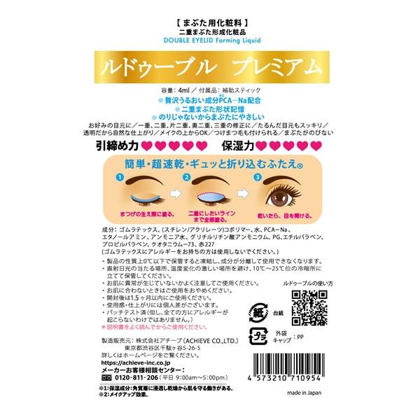 【商品詳細】 商品名:ルドゥーブル プレミアム 内容量:4ml 全成分: ゴムラテックス、(スチレン/アクリレーツ)コポリマー、水、PCA-Na、エタノールアミン、アンモニア水、グリチルリチン酸アンモニウム、PG、エチルパラベン、プロピルパラベン、クオタニウム-73、赤227 使用上の注意: ●使用感・仕上がりには個人差があります。 ●説明書をよく読んでからご使用ください。 ●ゴムラテックスにアレルギーをお持ちの方は使用しないでください。 ●製品の性質上0℃以下で保管すると凍結し、成分が分離して使用できなくなります。 ●直射日光の当たる場所、温度変化の激しい場所を避け、10℃~25℃位の冷暗所に立てて保管してください。 ●お肌に異常が生じていないかよく注意してご使用ください。 ●お肌に合わないときはご使用をおやめください。 ●開封後は1か月以内にご使用ください。 ●パッチテスト済(但し、全ての方にアレルギーが起こらないわけではありません。) 製造国:日本 区分:化粧品 メーカー:株式会社アチーブ 注意事項: 当社では複数店舗で在庫を共有しており、システムで在庫調整を行っておりますが、TV放映等による一時的な注文数の増大や、在庫の更新タイミングにより在庫にずれが生じる場合がございます。 在庫更新が間に合わずご注文頂いた商品が欠品となる場合もございます。 欠品が生じた場合や商品の発送が遅れる場合は、改めてご連絡させていただきます。 ご迷惑をお掛けする場合がございますが、あらかじめご了承くださいませ。 広告文責:株式会社エーウィル 0747-26-5566