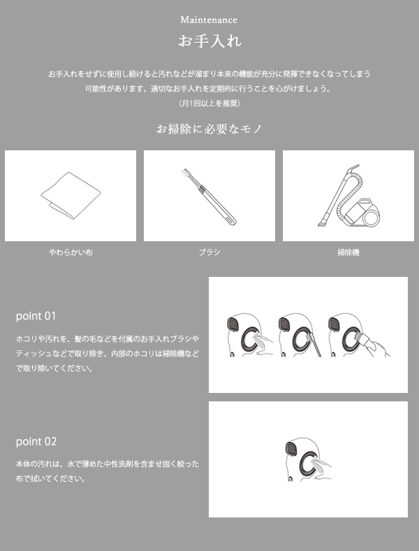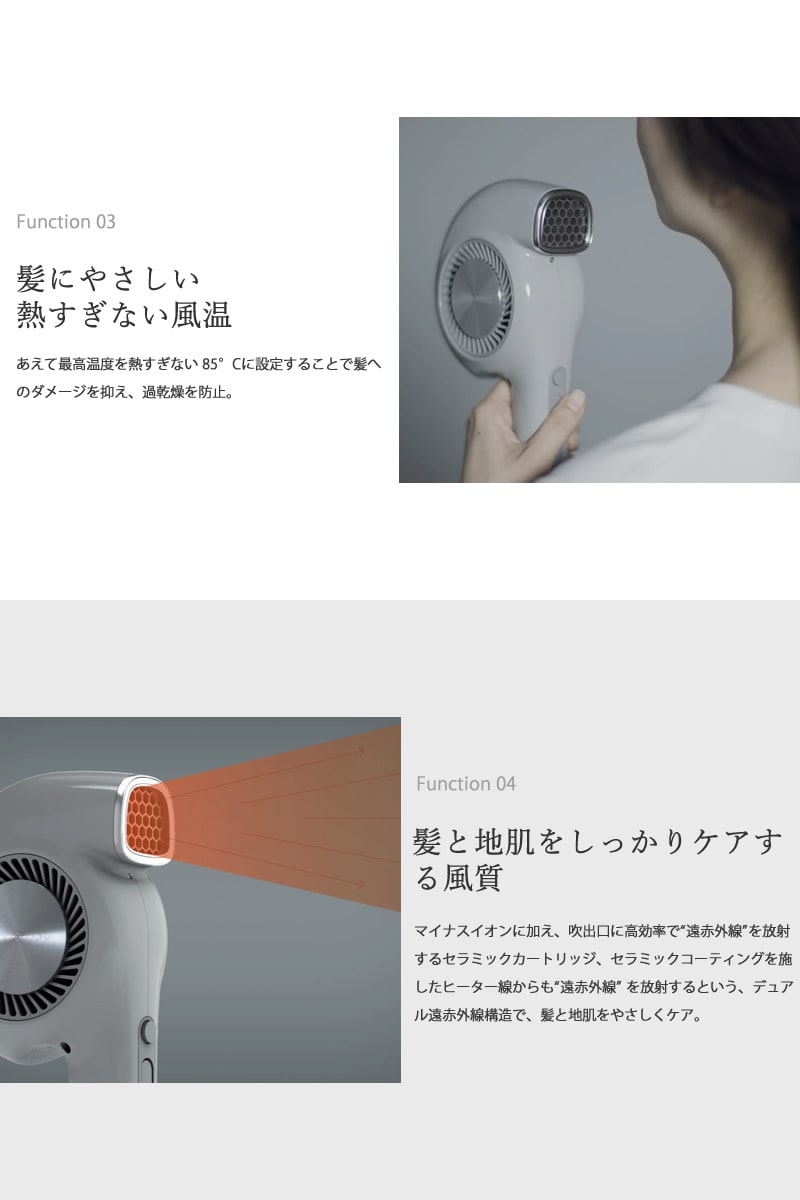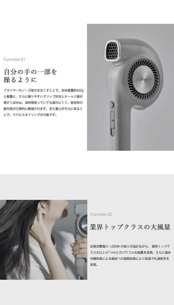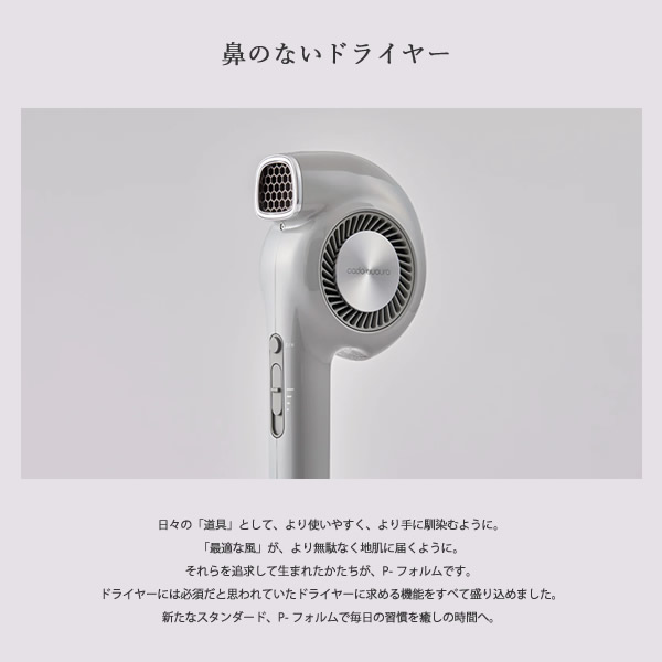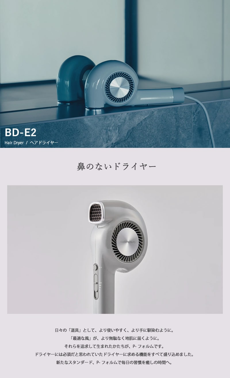 【商品詳細】 商品名:cado クオーラ ヘアドライヤー BD-E2 商品説明: 鼻のないドライヤー 日々の「道具」として、より使いやすく、より手に馴染むように。「最適な風」が、より無駄なく地肌に届くように。 それらを追求して生まれたかたちが、P-フォルムです。 ドライヤーには必須だと思われていたドライヤーに求める機能をすべて盛り込めました。 新たなスタンダード、P-フォルムで毎日の習慣を癒しの時間へ。 カラー: クールグレー ホワイト 仕様: 電源 AC100V 50/60Hz 消費電力 1,000W 風量 2.2 立方メートル/min 温風温度 約85℃(室温30℃ 風量「2」設定時) 外形寸法 幅 110mm×高さ 250mm×奥行き 60mm 質量 約400g(コードを除く) 電源コード長 約1.8m 付属品: スタイリングノズル、ストラップ、取扱説明書兼保証書、お手入れブラシ お手入れ: お手入れをせずに使用し続けると汚れなどが溜まり本来の機能が充分に発揮できなくなってしまう可能性があります。 適切なお手入れを定期的に行うことを心がけましょう。(月1回以上を推奨) 区分:家電 製造国:中国 メーカー:株式会社カドー 注意事項: 当社では複数店舗で在庫を共有しており、システムで在庫調整を行っておりますが、TV放映等による一時的な注文数の増大や、在庫の更新タイミングにより在庫にずれが生じる場合がございます。 在庫更新が間に合わずご注文頂いた商品が欠品となる場合もございます。 欠品が生じた場合や商品の発送が遅れる場合は、改めてご連絡させていただきます。 ご迷惑をお掛けする場合がございますが、あらかじめご了承くださいませ。 広告文責:株式会社エーウィル 0747-26-5566
