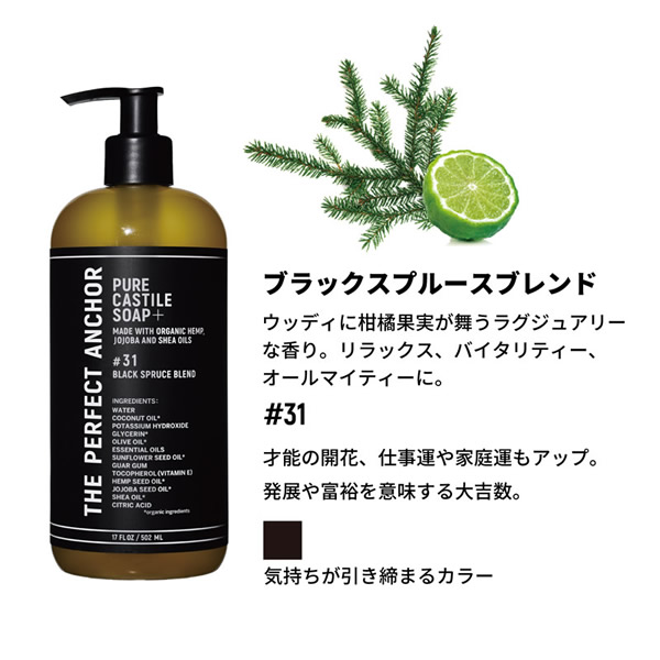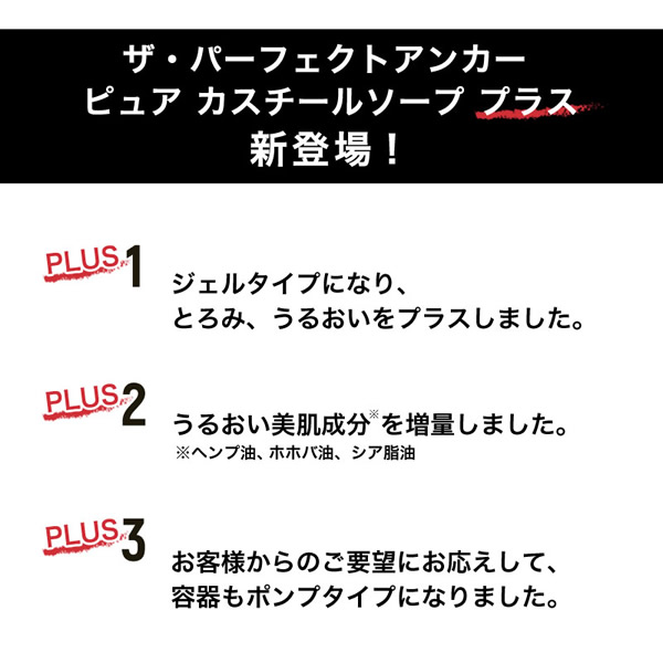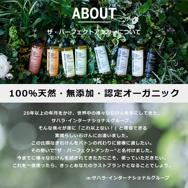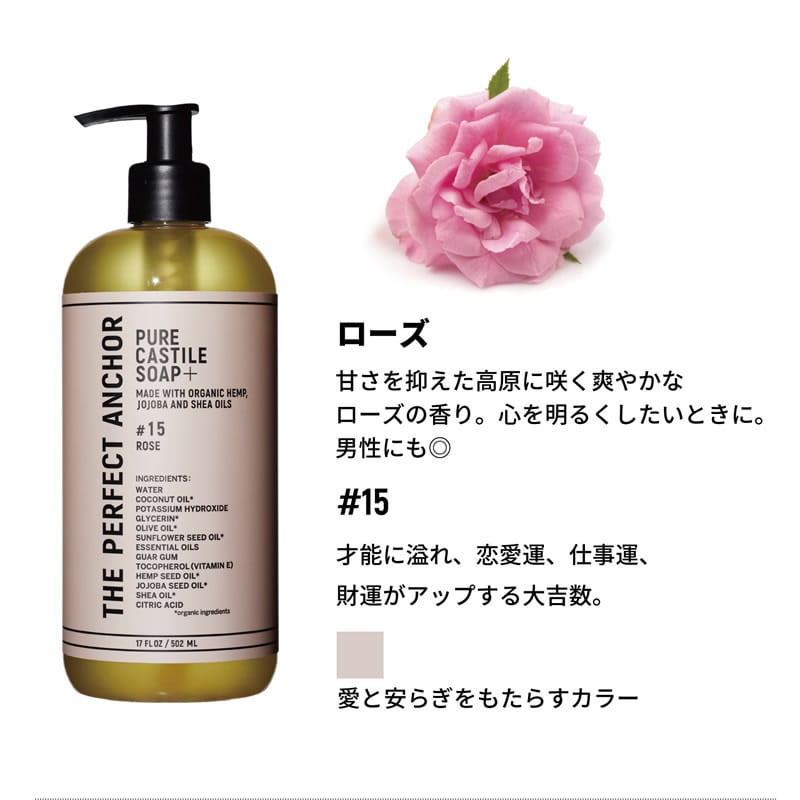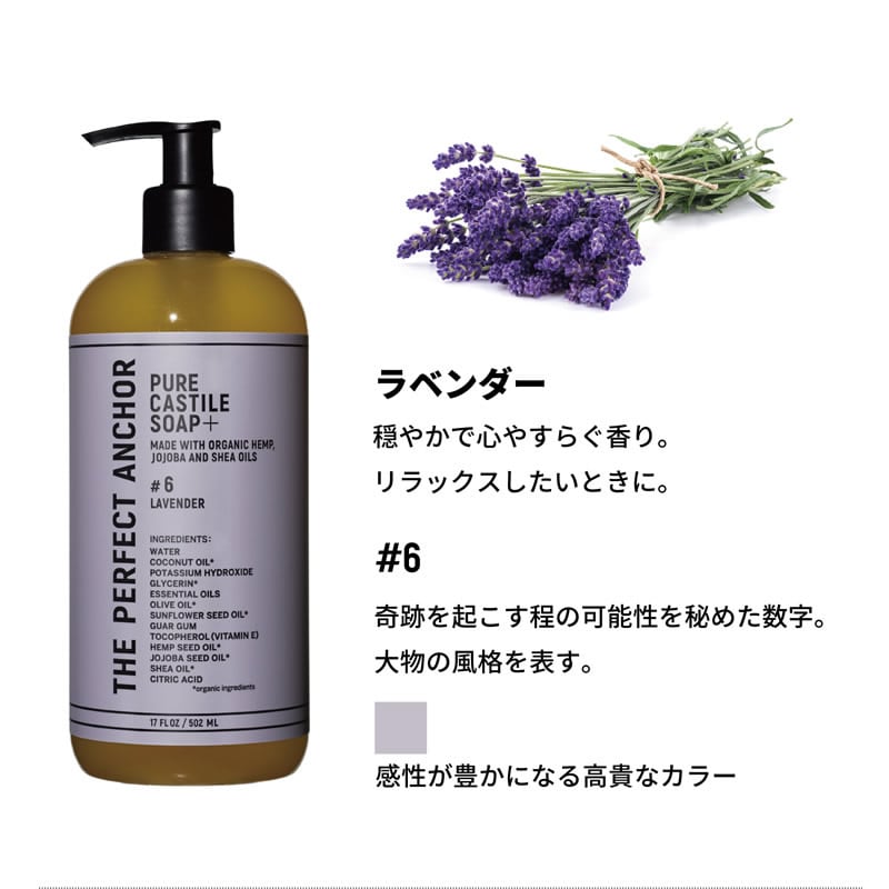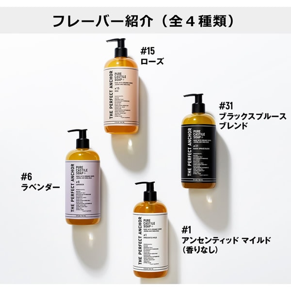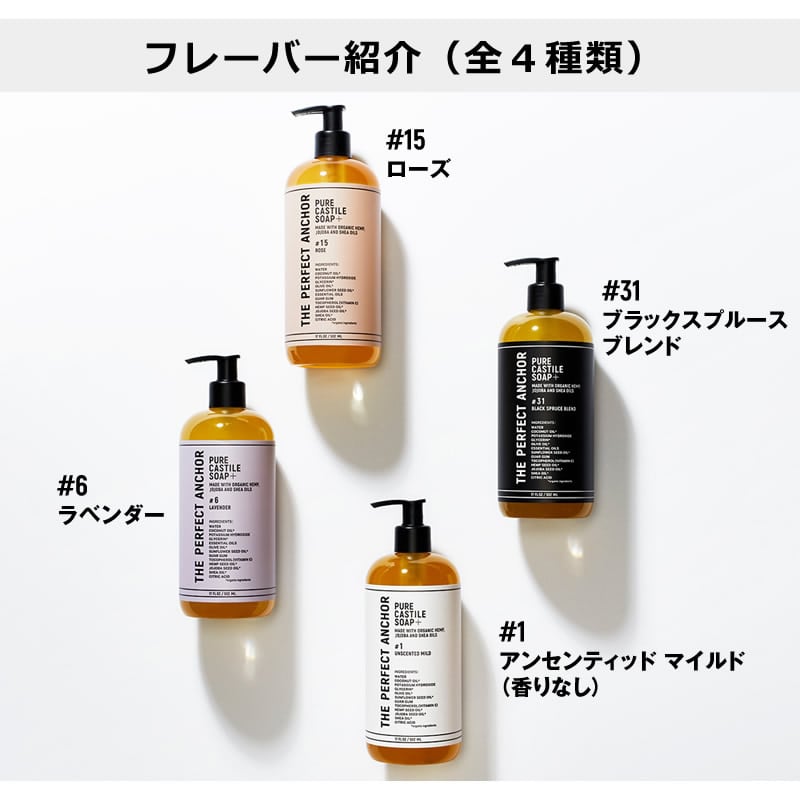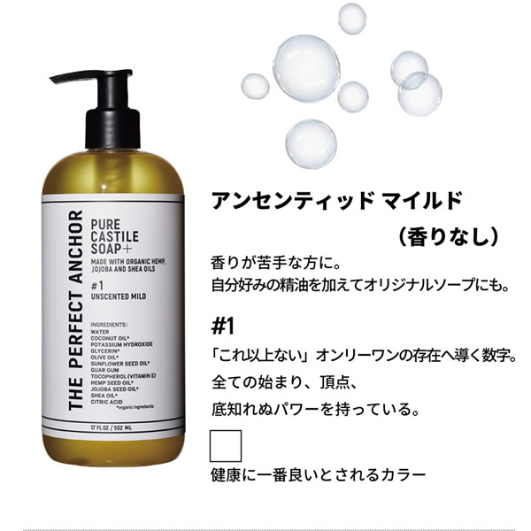 【商品詳細】 商品名:ザ・パーフェクトアンカー ピュアカスチールソープ プラス 内容量: ザ・パーフェクトアンカーからピュアカスチールソープ プラスが新登場! ・ジェルタイプになり、とろみ、うるおいをプラスしました。 ・うるおい美肌成分(ヘンプ油、ホホバ油、シア脂油)を増量しました。 ・お客様からのご要望にお応えして、容器もポンプタイプになりました。 ザ・パーフェクトアンカーは、100%天然・無添加で認定オーガニック。 日本人の肌に合うようにアレンジ済の米国製カスチールソープです。 [カスチールソープ -CASTILE SOAP-] 中世ヨーロッパのカステリヤ王国で作られていた、植物オイルを主体とした石けん。 王侯貴族が愛用していたことで知られています。 種類: #6 ラベンダー #15 ローズ #1 アンセンティッドマイルド #31 ブラックスプルースブレンド 内容量:502ml 成分: 水、ヤシ油*、水酸化K、グリセリン*、オリーブ果実油*、ヒマワリ種子油*、香料※(エッセンシャルオイル)、グアーガム、トコフェロール(ビタミンE)、アサ種子油*、ホホバ種子油*、シア脂油*、クエン酸 *オーガニック成分(オイルが石けん化する際にできるグリセリンは、そのまま残っております。) ※香料(エッセンスシャルオイル)は、アンセンティッドマイルドには入っていません。 使用方法: ポンプのノズルを反時計回りに回転させ、ロックを解除してプッシュすると石けんが出ます。 手やスポンジ、ネットを濡らし、適量の石けん(2~3プッシュ分)をとり、顔や体、手を洗ってください。 使い始めは石けんが出にくい場合がございますので、石けんが出るまで押し続けてください。 使用上の注意: ●自然成分なので、約15度以下で白く濁ったり、雪の結晶のようなものが出たりすることがあります。これは石けんの脂肪酸です。 ●さらに白く濁った部分と透明な部分に分離することもあります。温度が上がると透明に戻ります。また、色や香りにばらつきが出たりもします。 ●合成界面活性剤、安定剤不使用なので成分の一部が浮遊、沈殿したり、石けんに層が出たりすることがあります。どれも品質に問題はございません。 ●液体石けんの特性として、しばらく使っていないと石けんが固まってポンプの先が詰まることがあります。 ●詰まった時は、ポンプを何度か押して固まった部分を出し切ってからご使用ください。 ●目に入らないようにご注意ください。目に入った時は、すぐに水で洗い流し、医師にご相談ください。 ●乳幼児が飲んだり目に入れたりしないようご注意ください。 ●お肌に合わない時や異常のある時は使用を中止し、医師にご相談ください。 区分:化粧品 製造国:米国 発売元:株式会社サハラ・インターナショナルグループ 注意事項: 当社では複数店舗で在庫を共有しており、システムで在庫調整を行っておりますが、TV放映等による一時的な注文数の増大や、在庫の更新タイミングにより在庫にずれが生じる場合がございます。 在庫更新が間に合わずご注文頂いた商品が欠品となる場合もございます。 欠品が生じた場合や商品の発送が遅れる場合は、改めてご連絡させていただきます。 ご迷惑をお掛けする場合がございますが、あらかじめご了承くださいませ。 広告文責:株式会社エーウィル 0747-26-5566