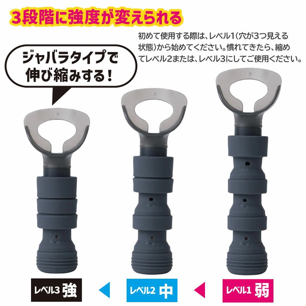 ジャバラタイプで伸ばしたり縮めたりするだけで簡単に3段階の強度を調節できます。お好みのレベルに合わせて使えます。