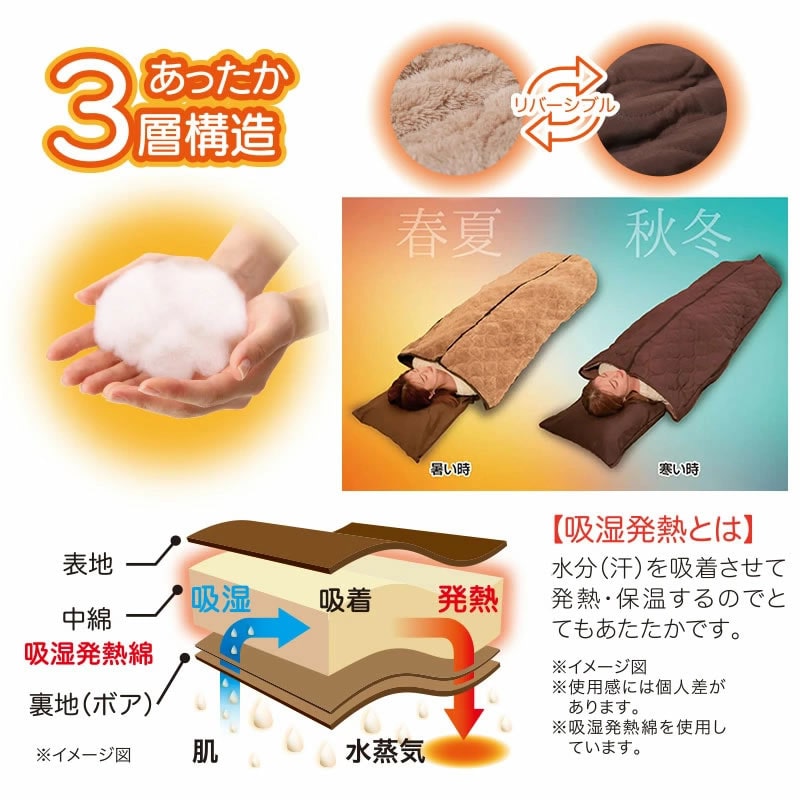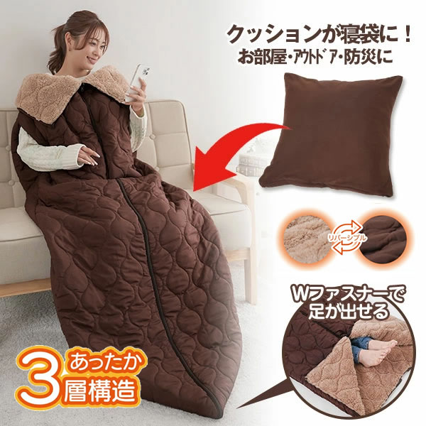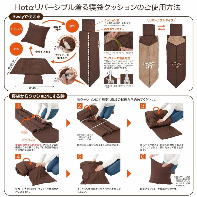 【商品詳細】 商品名:HOTαリバーシブル着る寝袋クッション 商品説明: 普段使いからアウトドア、災害まで大活躍!吸湿発熱綿であったか!手足が出せる着る寝袋。 あったか3層構造+吸湿発熱加工。あったか3層構造!吸湿発熱綿が汗などの水分を吸着させて発熱し、保温します。汎用綿より約+1.9℃の暖かさ! 使い分けできるリバーシブル仕様!あたたかいふわふわのボア生地とサラっと生地のリバーシブル仕様でオールシーズンお使いいただけます。あったかふわふわボア生地を内側に使用すれば、秋冬に。サラっと快適生地を内側に使用すれば、春夏に。 手足が出せると、こんなに便利!両サイドには手が出せるファスナーが付いています。寝袋に入ってからも本を読んだり、コーヒーを飲んだり、スマホを操作したり、好きなことを自由に出来ます。ダブルファスナー仕様で足元のファスナーを開けて足が出せます。 2つをつなげてダブルサイズに。2個つなげるとビッグサイズに。楽しいキャンプの夜は大切な人や家族と一緒に寝ることができます。 寝袋がクッションに!?コンパクト収納。クッション型カバー付きで寝袋として使わない時は一人でも簡単に折り畳めてコンパクトに収納できます!畳めば(約)45cm×45cmのクッションになり、リビングや車に置いても快適なクッションとしてご使用いただけます。 あらゆるシーンで大活躍♪普段はクッションとしてお部屋に置いて、使いたい時に広げれば、着る毛布や寝袋、布団として使えます。クッションとして置いておけるので、急な災害時などに備えとしても役立ちます。 カラー:ブラウン サイズ:D1.0×W140.0×H190.0cm ※広げた場合のサイズです。 ※クッションサイズ/よこ45.0×たて45.0cm 重量:1350g 材質:本体生地・中材/ポリエステル100% ご使用方法: 寝袋からクッションにする時 ※クッションにする際は寝袋の状態から始めてください。 1.寝袋の状態から始めます。クッション袋の横幅より少し狭くなるように布団部の左右を折りたたみます。 2.縦方向に三等分になるようにたたみます。 ※やりにくい場合は足先のファスナーを開けてください。 3.真ん中を押さえて、たたんだ部分を起こすように、クッション袋に向かって持ち上げます。 4.持ち上げた布団部を、クッション袋の中に押し込みます。 5.クッション袋内部に手を入れて形を整えてください。 6.最後にファスナーを閉めて完成です。 ※適応サイズ(約)45cm×45cmの市販のクッションカバーに入れる事も出来ます。 使用上のご注意: ●中綿の特性上、静電気や摩擦、生地の伸縮により中綿が抜け出ることがあります。その場合引っ張り出さず、内側からつまんで中に戻してください。無理に引っ張り出すと、穴が大きくなり、中綿が抜けやすくなりますのでご注意ください。 ●中綿が片寄ってしまったら、表面を軽くほぐすようにたたき、内部の中綿を均一になるようにならしてください。 ●中綿がペタッとなった場合は、くしゃくしゃと揉んだ後よく振っていただくと中綿が膨らんでふんわりします。 ●洗濯後、濡れたまま放置すると、中綿が固まって膨らみがなくなったり、中綿が劣化したりする場合がございますので、速やかに日陰の風通しの良い場所で形を整えてから乾かしてください。 ●お肌に合わない場合や、かぶれ・かゆみ等を感じた場合はご使用をおやめください。 ●生地部分に爪を立てたり、ファスナーを無理に引っ張ると破れるおそれがありますのでご注意ください。 ●使用感には個人差があります。 ●生地の特性上、多少生地のにおいがする場合があります。ご使用には問題ございませんが、気になられる場合は一度陰干ししてからご使用ください。 ●ご使用中、またはご使用後に異常を感じた場合はすぐにご使用をおやめください。 ●本品は中綿に吸湿発熱綿を使用しておりますが、本品自体が発熱することはありません。 ●あたたかさの感じ方には個人差があります。 ●乳幼児の手の届かない場所に保管してください。 ●火気のそばや高温多湿な場所、直射日光の当たる場所には保管しないでください。 ●本来の目的以外でのご使用はおやめください。 ●本品の仕様やデザインは予告なく変更する場合があります。 ●印刷の都合上、実際の商品と多少色が異なる場合があります。 製造国:中国 区分:寝具 メーカー:株式会社ニーズ 注意事項: 当社では複数店舗で在庫を共有しており、システムで在庫調整を行っておりますが、TV放映等による一時的な注文数の増大や、在庫の更新タイミングにより在庫にずれが生じる場合がございます。 在庫更新が間に合わずご注文頂いた商品が欠品となる場合もございます。 欠品が生じた場合や商品の発送が遅れる場合は、改めてご連絡させていただきます。 ご迷惑をお掛けする場合がございますが、あらかじめご了承くださいませ。 広告文責:株式会社エーウィル 0747-26-5566