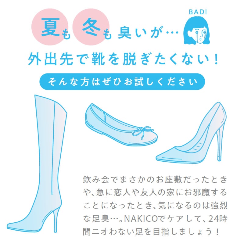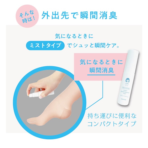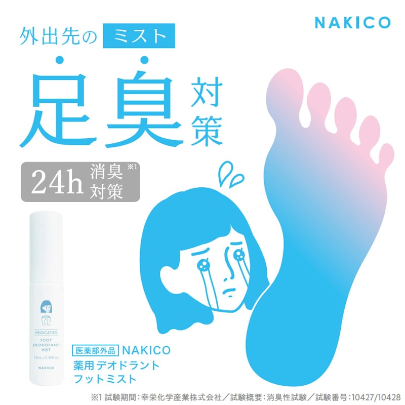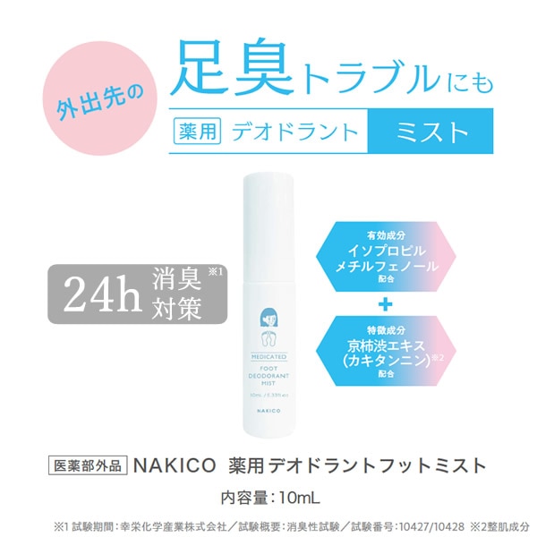 【商品詳細】 商品名: NAKICO 薬用デオドラントフットミスト 商品説明: 有効成分「イソプロピルメチルフェノール」でニオイの元を殺菌・消臭! いつでもどこでも緊急時に使いやすいコンパクトミストタイプ 厳選ボタニカルハーブ配合 内容量: 10ml 全成分: 【有効成分】イソプロピルメチルフェノール 【その他の成分】精製水、エタノール、1,3-ブチレングリコール、チャエキス(1)、チャ乾溜液、シラカバエキス、イチョウエキス、オウゴンエキス、カンゾウ抽出末、アラントイン、クエン酸、クエン酸ナトリウム、ポリオキシエチレン硬化ヒマシ油、ポリオキシエチレンポリオキシプロピレンブチルエーテル、無水エタノール、香料、フェノキシエタノール 効果または効能: 皮膚汗臭、ワキガ(腋臭) 使用方法: お肌から10~15cm程度離して少量ずつスプレーしてください。 使用上の注意: ●お肌に異常が生じていないかよく注意して使用してください。本品がお肌に合わないとき、即ち次のような場合には、使用を中止してください。そのまま使用を続けますと症状を悪化させることがありますので、皮膚科専門医等にご相談されることをおすすめします。 (1)使用中、赤み、はれ、かゆみ、刺激、色抜け(白斑等)や黒ずみ等の異常があらわれた場合 (2)使用したお肌に、直射日光があたって上記のような異常があらわれた場合 ●傷やはれもの、しっしん等、異常のある部位にはお使いにならないでください。 ●目に入ったときは、直ちに洗い流してください。 ●ご使用後は必ずしっかりキャップをしめてください。 ●直射日光のあたる場所や高温多湿、極端に低温の場所には保管しないでください。 ●乳幼児の手の届かないところに保管してください。 原産国: 日本 区分: 医薬部外品 メーカー: 株式会社プラセス製薬 注意事項: 当社では複数店舗で在庫を共有しており、システムで在庫調整を行っておりますが、TV放映等による一時的な注文数の増大や、在庫の更新タイミングにより在庫にずれが生じる場合がございます。 在庫更新が間に合わずご注文頂いた商品が欠品となる場合もございます。 欠品が生じた場合や商品の発送が遅れる場合は、改めてご連絡させていただきます。 ご迷惑をお掛けする場合がございますが、あらかじめご了承くださいませ。 広告文責: 株式会社エーウィル 0747-26-5566