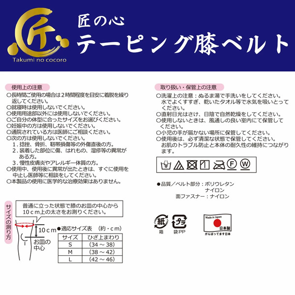 【商品詳細】 商品名: 匠の心 テーピング膝ベルト 商品説明: スリムなパンツでもひびきにくい極薄タイプ! 軽くて薄いのに膝をしっかりホールドし曲げ伸ばしを補助。 伸縮性のある素材でグッと伸びてピタッとフィット。 しなやかで軽い両側のボーンが巻き上がりを防止し膝の曲げ伸ばしをサポート。 薄いので膝裏もごわつきにくく、脚にフィット。 サイズ調整と着脱が簡単な面ファスナー。 ものづくりの国、日本で製造。 目視による全品検品を行い、永年変わることなく品質の維持に努めています。 女性・男性兼用。 内容量: ひざ用1枚 カラー: ベージュ ブラック 適応サイズ: ひざ上まわり(膝のお皿の中心から10cm上の太さ) Sサイズ 約34~38cm Mサイズ 約38~42cm Lサイズ 約42~46cm 材質: ベルト部分 ポリウレタン、ナイロン 面ファスナー ナイロン 使用方法: ご使用になる前に「使用上の注意」をよくお読みのうえ、正しくお使いください。 使用上の注意: 【使用上の注意】 ●長時間ご使用の場合は2時間程度を目安に着脱を繰り返してください。 ●就寝時は使用しないでください。 ●使用用途部以外には使用しないでください。 ●ご自分の体型に合ったサイズをお選びください。 ●妊娠中の方は使用しないでください。 ●通院されている方は医師にご相談ください。 ●次の方は使用しないでください。 1.捻挫、骨折、靭帯損傷等の外傷直後の方。 2.装着した部位に傷、はれもの、湿疹等の異常がある方。 3.慢性皮膚炎やアレルギー体質の方。 ●使用中、使用後に異常が出たときは、すぐに使用を中止し医師等に相談をしてください。 ●本製品の使用に医学的な治療効果はありません。 【取り扱い・保管上の注意】 ●洗濯上の注意:ぬるま湯で手洗いをしてください。水でよくすすぎ、乾いたタオル等で水気を吸いとってください。 ●直射日光はさけ、日陰で自然乾燥をしてください。 ●使用しないときは、風通しの良い室内にて保管してください。 ●小児の手が届かない場所に保管してください。 ●使用後は、必ず清潔な状態で保管してください。お肌のトラブル防止と本体の耐久性の維持につながります。 製造国: 日本 区分: 雑貨 メーカー: 秀英産業株式会社 注意事項: 当社では複数店舗で在庫を共有しており、システムで在庫調整を行っておりますが、TV放映等による一時的な注文数の増大や、在庫の更新タイミングにより在庫にずれが生じる場合がございます。 在庫更新が間に合わずご注文頂いた商品が欠品となる場合もございます。 欠品が生じた場合や商品の発送が遅れる場合は、改めてご連絡させていただきます。 ご迷惑をお掛けする場合がございますが、あらかじめご了承くださいませ。 広告文責: 株式会社エーウィル 0747-26-5566