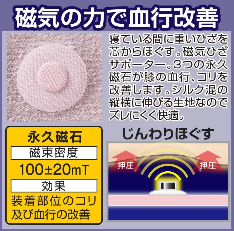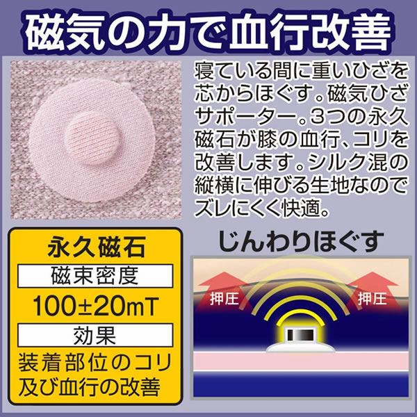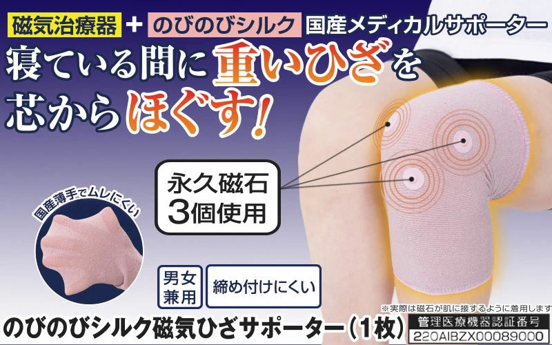 【商品詳細】 商品名: のびのびシルク磁気ひざサポーター(1枚) <管理医療機器> 商品説明: 磁気治療器+のびのびシルク国産メディカルサポーター。 寝ている間に重い膝を芯からほぐす磁気ひざサポーター。 3つの永久磁石が膝の血行、コリを改善します。 縦横に伸びるシルク混生地なので、ズレにくく快適です。 適応サイズ: ひざ周り25~42cm 材質: シルク、ナイロン、ポリウレタン 重量: 約35g 効果効能: 【磁束密度】100±20mT 【効果】装着部位のコリ及び血行の改善 管理医療機器認証番号: 220AIBZX00089000 ご使用方法: ※ご使用前に別紙の添付文書を必ずお読みください。 ※左右はございません。 1.折り返しがある方が上にくるように着用します。磁石が肌面に接するように着用します。 2.無理に引っ張ると破損する可能性がありますので、着用の際は引っ張らず、ゆっくりと履き込んでください。 3.磁石がひざの中心を囲むように、サポーターの位置を確認しながら着用ください。 4.着用後は生地の折れやゆがみがない様、手で馴染ませながらご確認ください。 使用上のご注意: ●ご自分のサイズに合わない場合、使用しないでください。 ●濡れた状態で着用すると摩擦等で他のものに色移りする場合があります。 生産国: 日本 区分: 管理医療機器 メーカー: 株式会社ホットクラス 注意事項: 当社では複数店舗で在庫を共有しており、システムで在庫調整を行っておりますが、TV放映等による一時的な注文数の増大や、在庫の更新タイミングにより在庫にずれが生じる場合がございます。 在庫更新が間に合わずご注文頂いた商品が欠品となる場合もございます。 欠品が生じた場合や商品の発送が遅れる場合は、改めてご連絡させていただきます。 ご迷惑をお掛けする場合がございますが、あらかじめご了承くださいませ。 広告文責: 株式会社エーウィル 0747-26-5566 関連キーワード: 血行改善 磁気治療器 コリ 永久磁石 磁気サポーター ひざサポーター 男女兼用 国産 日本製 シルク ひざ 膝 ギフト 贈り物 プレゼント