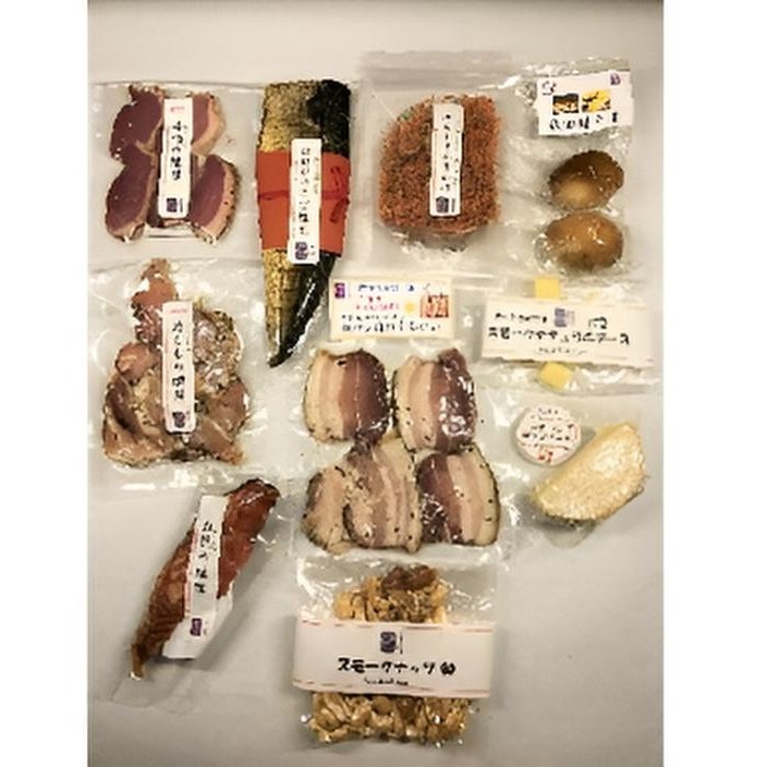 さばの燻製、紅鮭の燻製、やわらかベーコン豚バラ肉の燻製、合鴨の燻製(ワイン風味)、鶏ももの燻製(ハーブ味)、スモークカマンベール、ナチュラルチーズの燻製、秋田燻たま、スモークナッツ、スモークふりかけ:計10種の燻製が入った詰合せです。