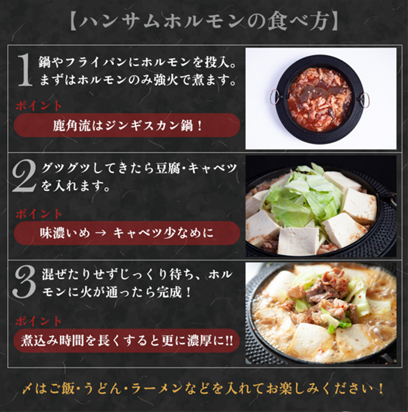 ホルモンの上に乗せたキャベツが蓋代わりになりますので、蓋をせず、適度に水分をとばして頂ければ美味しくなります。