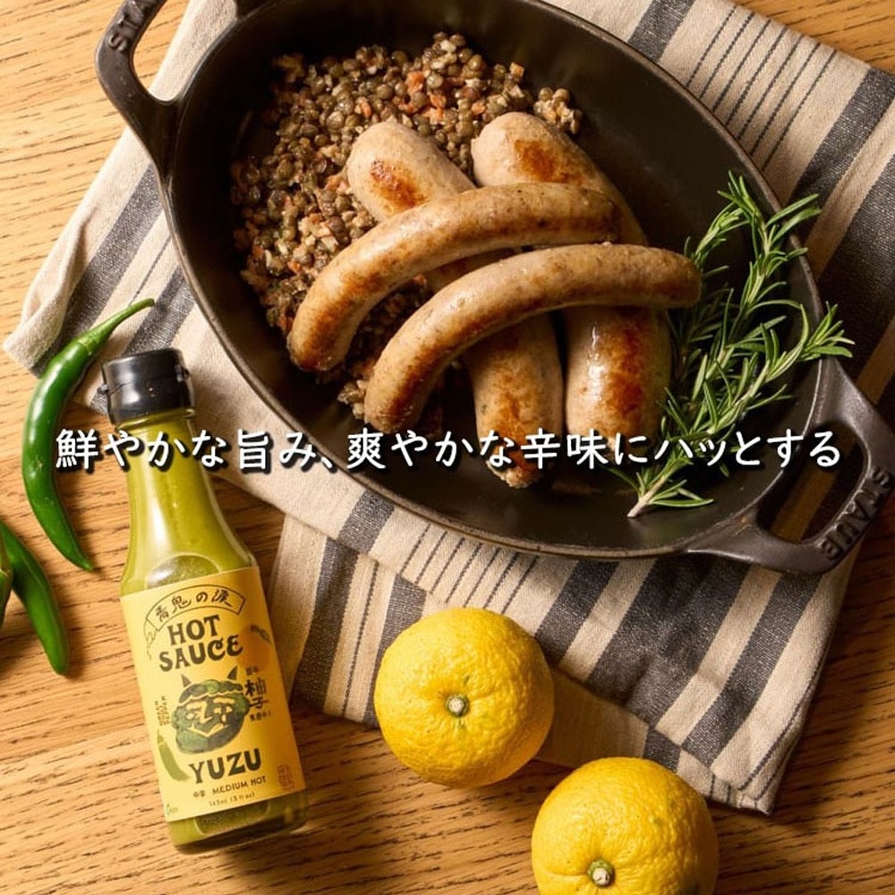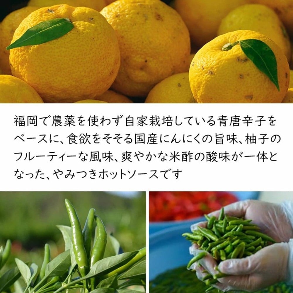 青唐辛子をベースに、食欲そそる国産にんにくの旨味、柚子のフルーティーな風味、爽やかな米酢の酸味が一体となった、旨辛ホットソースです。