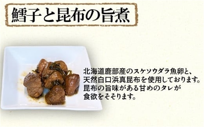 助宗たら卵(北海道鹿部産)、砂糖、醤油、昆布(北海道鹿部産)、本みりん、(一部に小麦・大豆を含む)