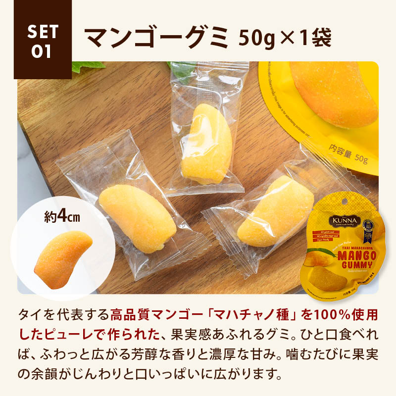 タイを代表する高品質マンゴー「マハチャノ種」を100%使用したピューレで作られた、果実感あふれるグミ。