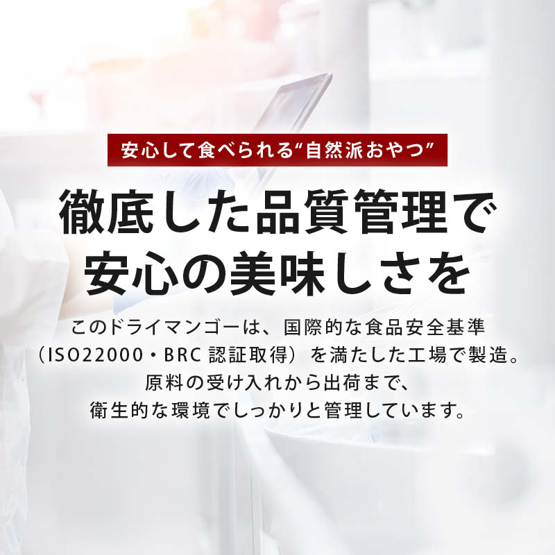 このドライマンゴーは、国際的な食品安全基準(ISO22000・BRC認証取得)を満たした工場で製造。