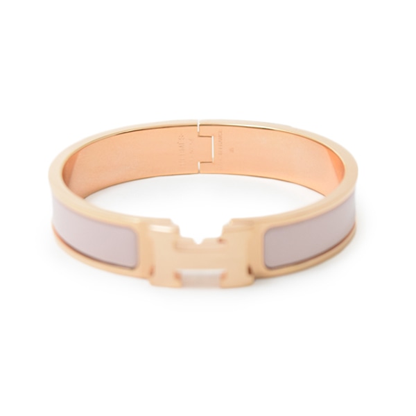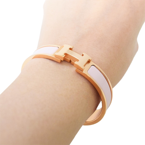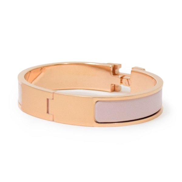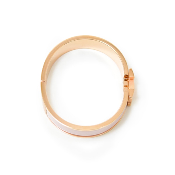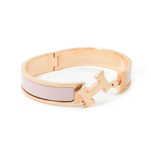艶のあるエナメルカラーが魅力的なブレスレット。留め具はブランドの象徴とも言える「H」の形に ●サイズ:腕回り 約17cm 幅 約1.2cm ●重量:約40g ●素材:ローズゴールドメッキ ●カラー:Rose Candeur ●付属品:箱