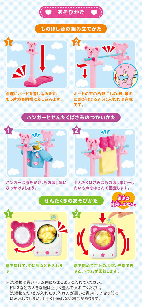 せんたくものをハンガーにかけて、ものほし竿にかけたり、せんたくばさみではさんだり、おせんたくごっこが楽しめます。