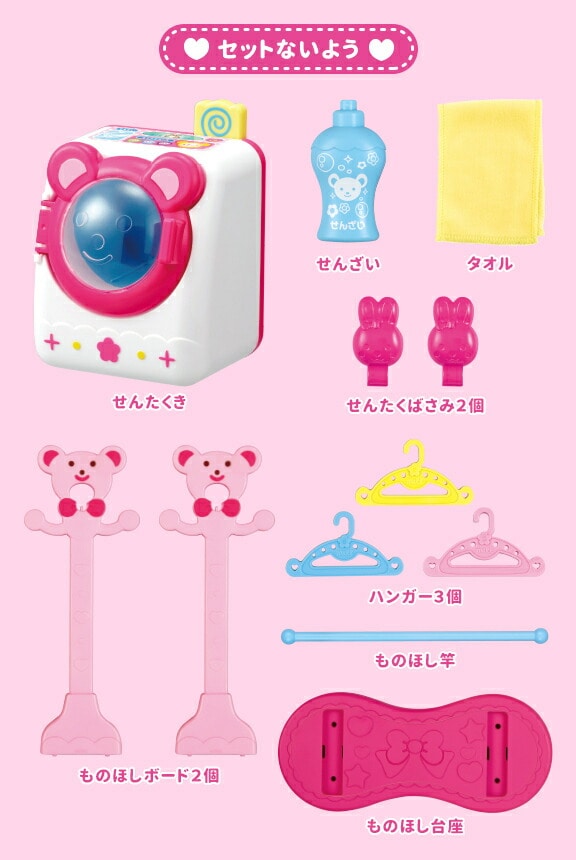 せんたくき、せんざい、タオル、せんたくばさみ2個、ハンガー3個、ものほし竿、ものほし台座、ものほしボード2個