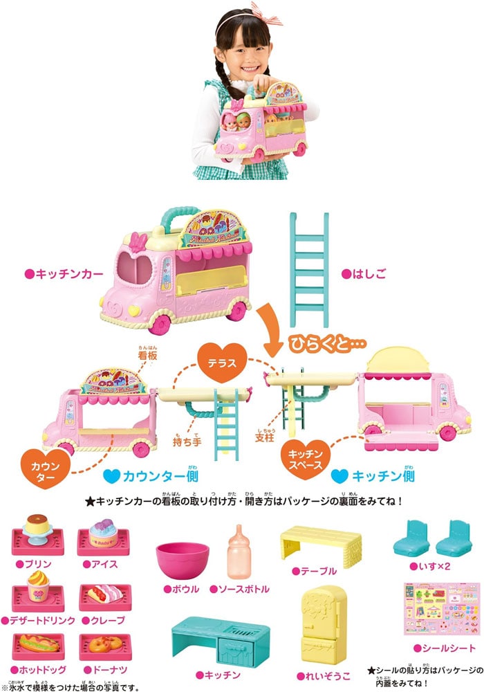 キッチンカー、はしご、プリン、アイス、デザートドリンク、クレープ、ホットドッグ、ドーナツ、ボウル、ソースボトル、キッチン、れいぞうこ、テーブル、いす×2、シールシート