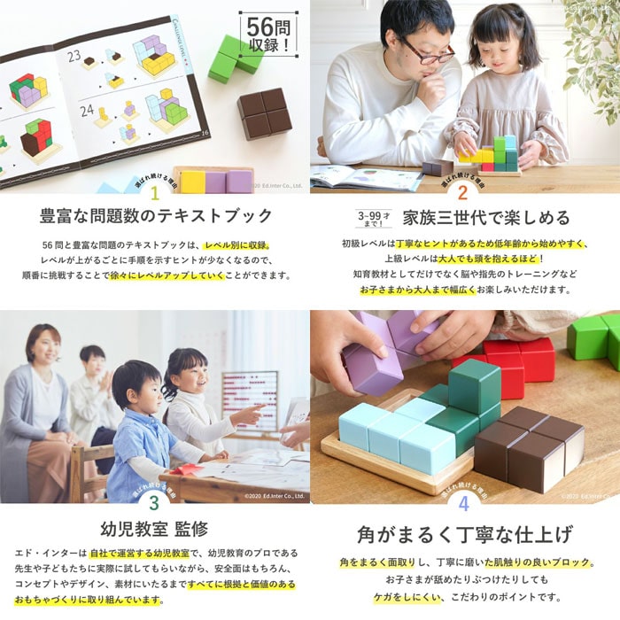 立方体が完成したときの満足感が繰り返しチャレンジする意欲を引き出し、忍耐力と集中力を養います。