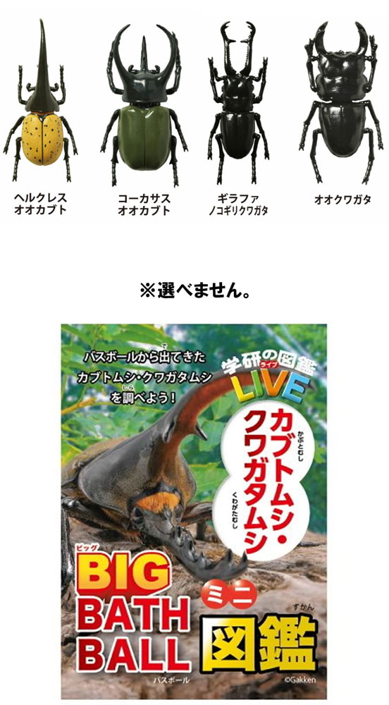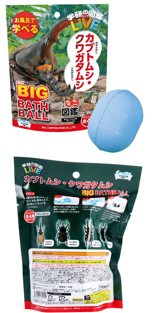 「学研の図鑑LIVE」バスボールシリーズの「カブトムシ・クワガタムシ」のリアルなマスコットと、ミニ図鑑が入ったのBIGサイズ(180g)のバスボールです。