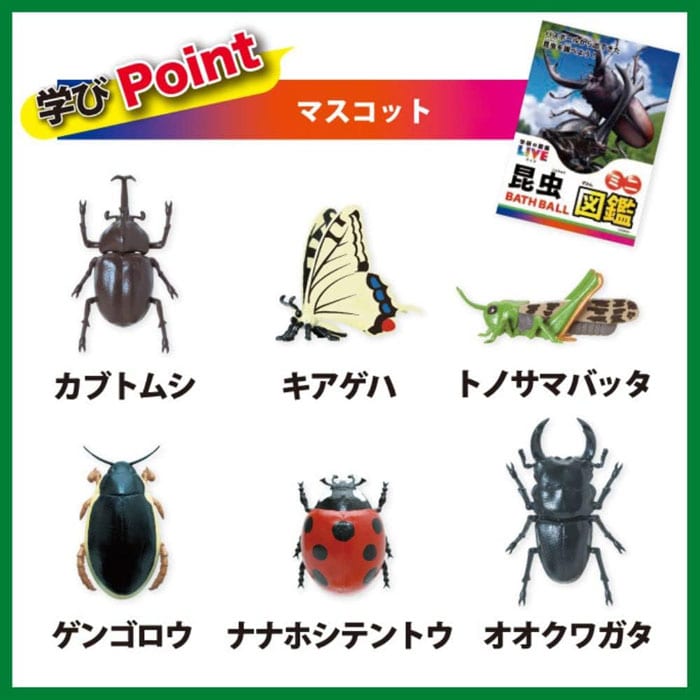 ●リアルな昆虫のマスコットが入ったバスボールと、マスコットで出てくる昆虫に関する知識が深まる情報が掲載されているミニ図鑑のセットです。