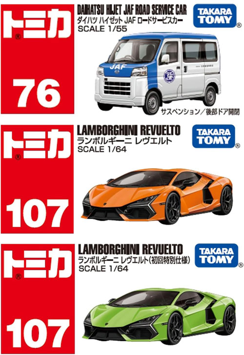 トミカ 3点セット (No.107 ランボルギーニ レヴエルト 初回版&通常版 + No.76 ダイハツ ハイゼット JAF ロードサービスカー)