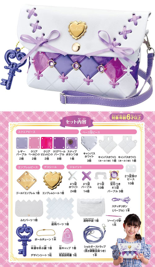 ピース33個、ジョイント51個、中袋1個、ボールチェーン1本、ショルダーストラップ1本、ソーイング針1本、リボン1本、チャーム1個、指キャップ1個、エンブレムシール1個、デザインシート1枚、取扱説明書1枚