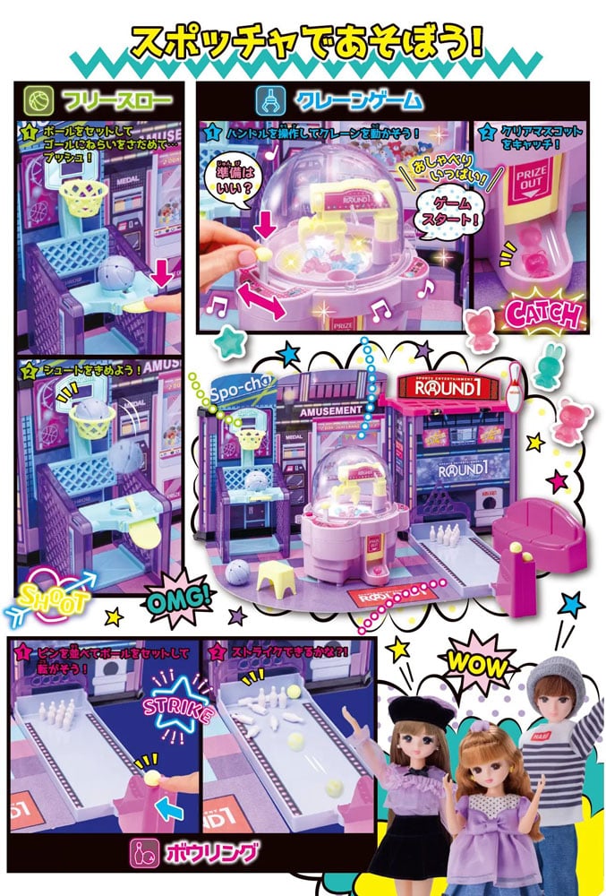 みんなでいこうよラウンドワン! カラフルに光るおしゃべりいっぱいのクレーンゲームやボウリングゲーム、フリースローゲームでリカちゃんファミリーと一緒に遊ぼう★
