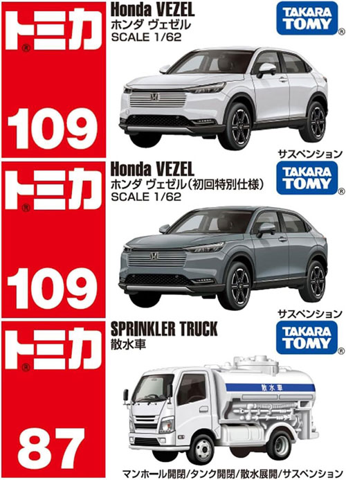 トミカ 3点セット (No.109 ホンダ ヴェゼル 初回版&通常版 + No.87 散水車)