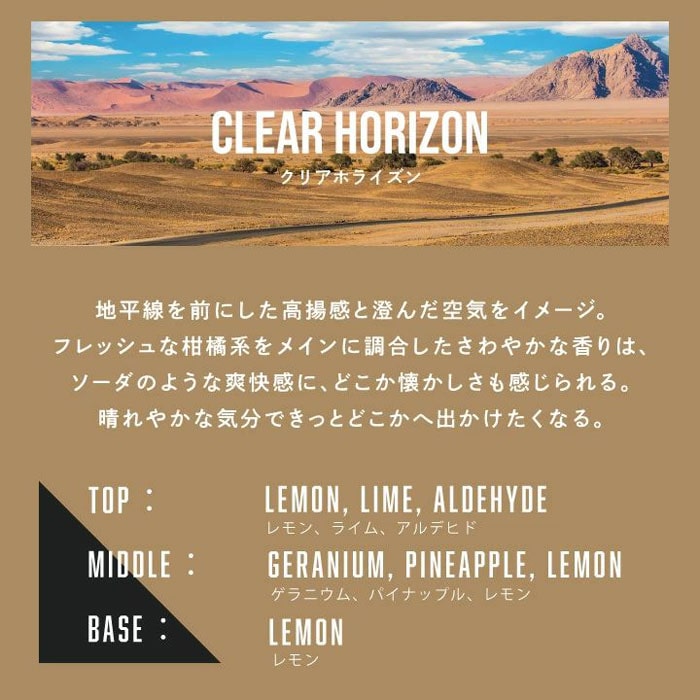 ■香り:CLEAR HORIZON: 見渡す限り広がる地平線を前にどこまでも進んで行きたくなるような澄んだ香り