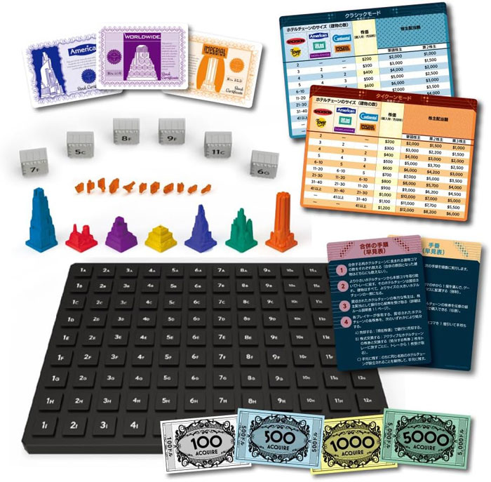 稼いだお金でさらに株を買い、ゲーム進行に伴い巨大になっていくホテルチェーン同士を上手に合併させて、さらに多額のお金を稼ぎましょう。