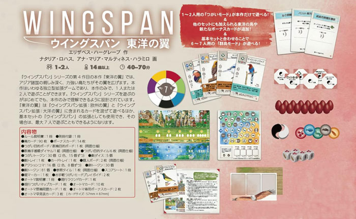 さらに、基本セット『ウイングスパン』と組み合わせることにより、6~7人で遊べる「郡鳥モード」のルールを収録。