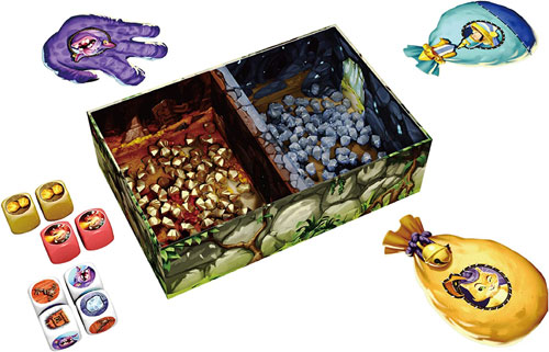 洞窟に見立てた箱からできるだけ多くの財宝を持ち帰るダイスゲームです。
