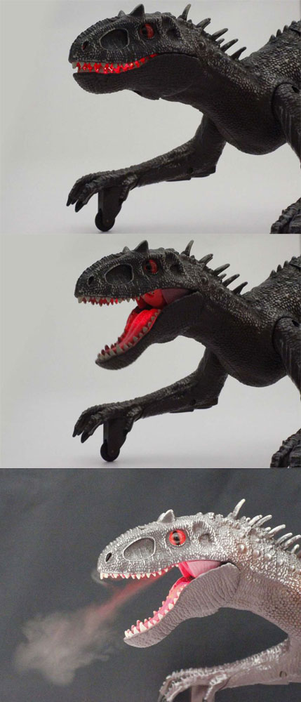 ●恐竜がリアルに歩き、ほえて、水蒸気を吐く! 本物の恐竜の動きを再現したR/Cモデルです。