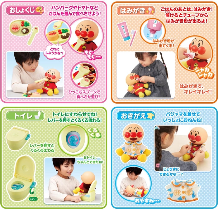 おはようからおやすみまで、はじめてのお世話ごっこが楽しめる!アンパンマン人形とお世話グッズのセットです。