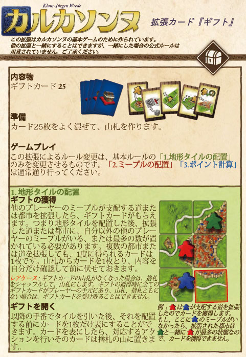 タイル配置時に、他のプレーヤーのミープルが支配している都市または道を拡張すると、ギフトカードが1枚もらえます。