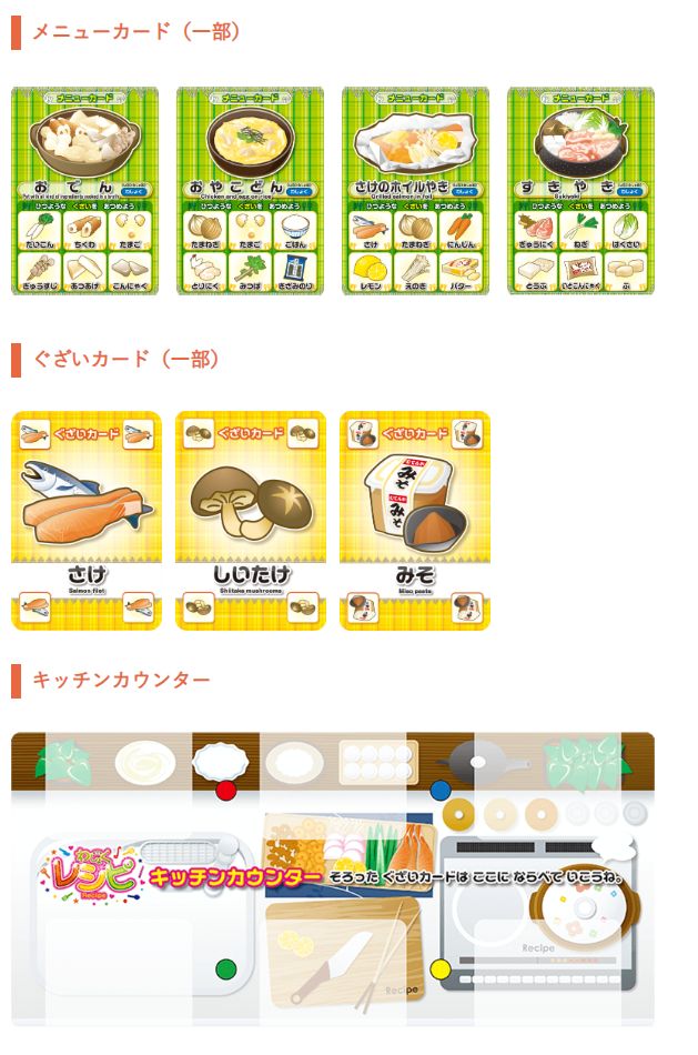 レシピの“和食限定”バージョン!ユネスコ無形文化遺産にも登録された和食。和食が世界中で注目される中、和食離れが進む子ども達に日本料理の良さを遊びながら伝えていくことができます。洋食や中華とはまたちがった“ぐざい”が好奇心をかきたててくれるので、ますますお料理に興味をもてます。“ぐざい”も新たに数多く追加になったので、さらに楽しくなりました。