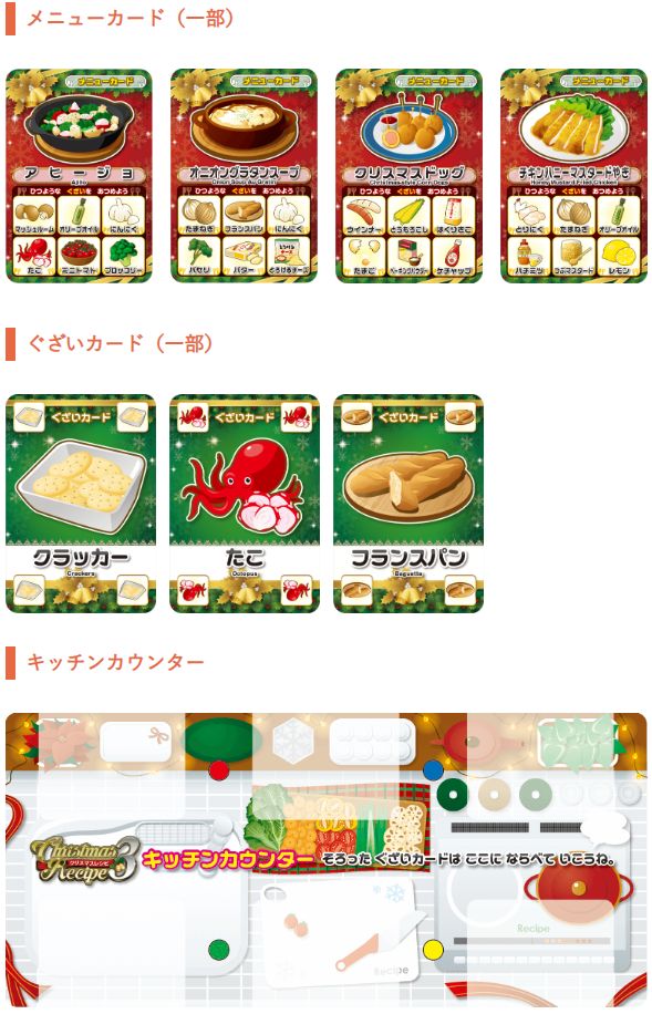 クリスマスレシピシリーズの完結版となる第3弾も、ローストビーフ、ブッシュドノエル、アヒージョなどクリスマスパーティーで見かけそうなメニューが8種類、複数のぐざいも新たに登場!『1』や『2』同様、カードはもちろんホログラム加工が施されており、シリーズ通してのキラキラカードでクリスマス気分が高まります。