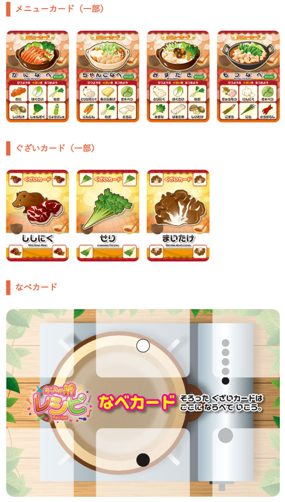 メニューカード:8枚 / ぐざいカード:48枚 なべカード:2枚1組×4セット 取扱説明書:1枚 / 取扱注意書:1枚
