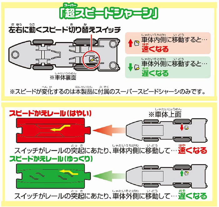 付属の「スピードかえレール」(はやい・ゆっくり)を組み込めば好きなところでスピードの変化が楽しめます。浮上をイメージして車輪は半透明になっています。