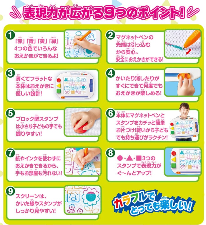 カラフルでとっても楽しい!「赤」「青」「黄」「緑」の4つのカラーでいろんなおえかきができます。