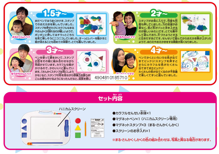 お子様がペンを握れるようになるころに始まる「なぐりがき」から、「もじのれんしゅう」までお子さまの「かきたい」気持ちにこたえる、成長に合わせ長く遊んでいただける安全で楽しいおえかき玩具です。