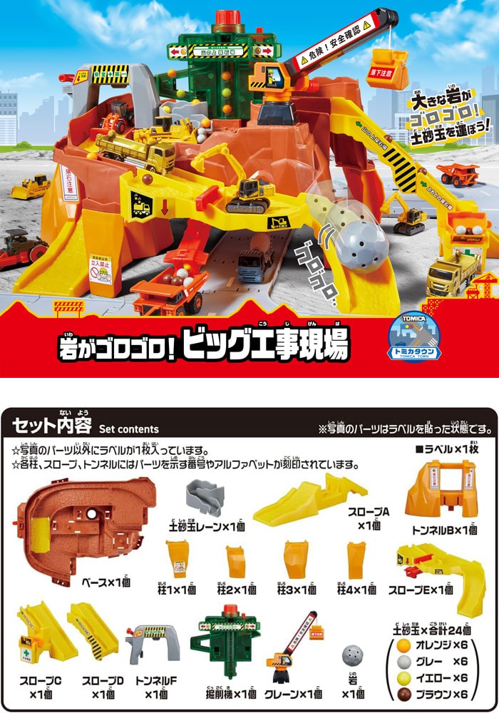 ・簡単組み立てで大きな工事現場が完成、デコボコ・ゴツゴツしたコースでトミカ手転がし走行が楽しめます。