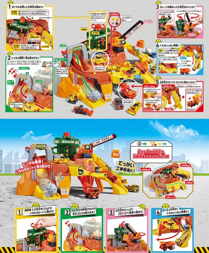 トミカのダンプカーやブルドーザを使った土砂玉の積み下ろし遊びやトンネル開通遊びが楽しめます。