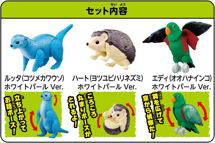 ルッタ(コツメカワウソ)ホワイトパールVer. (1)、ハート(ヨツユビハリネズミ)ホワイトパールVer. (1)、エディ(オオハナインコ)ホワイトパールVer.(1)、ジオラマシート(1)