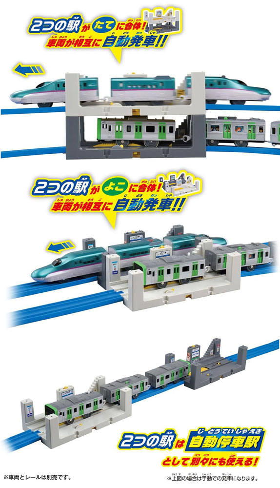 車両が駅に到着すると、もう1両が自動で発車! たてにもよこにもつながる駅で相互発車を楽しもう!