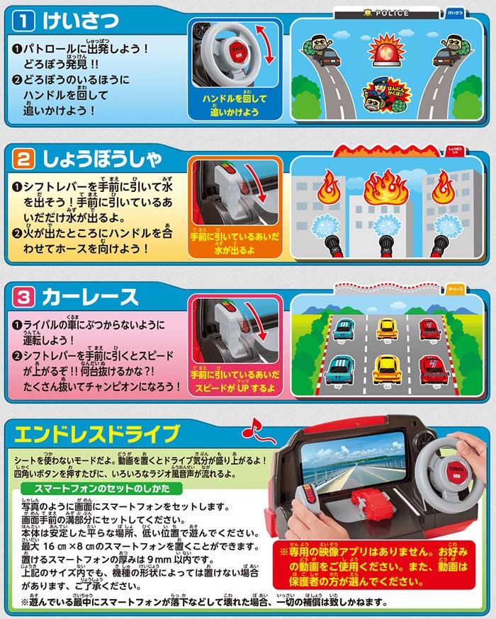 ハンドル操作で運転をして、様々なミッションにチャレンジしよう!