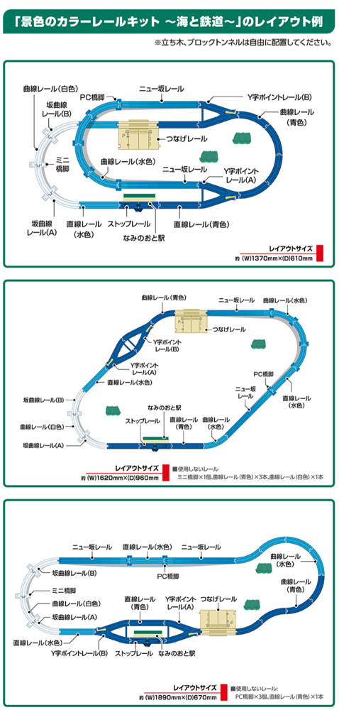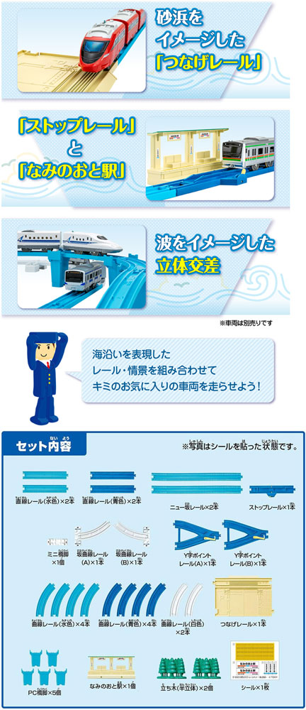 波をイメージした3色のレールと、砂浜の雰囲気のつなげレールや駅を組み合わせて海沿いのイメージが作れるレールキットです。